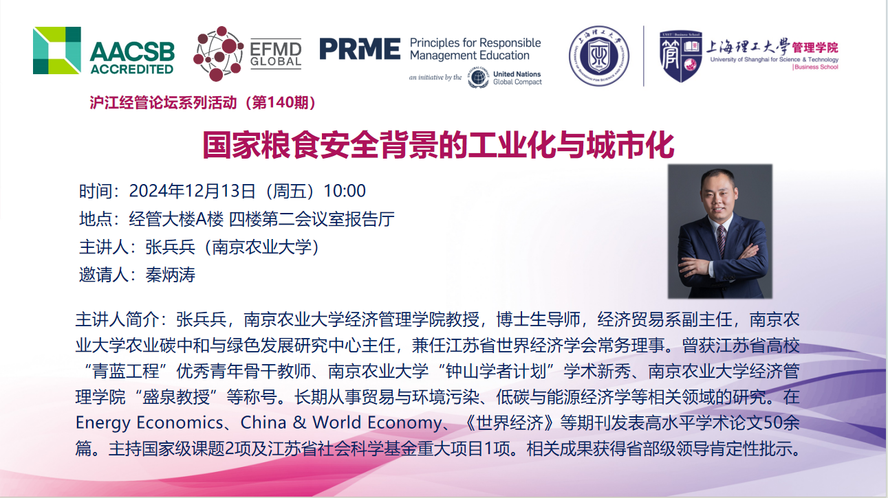 沪江经管论坛系列活动(第140期):国家粮食安全背景的工业化与城市化