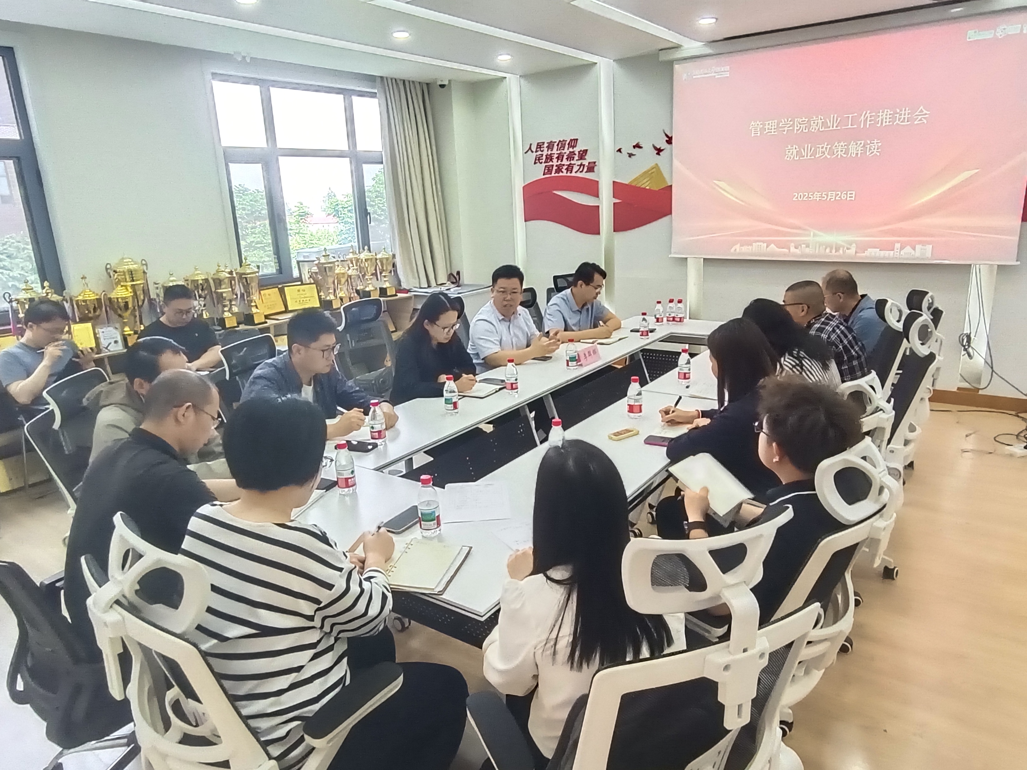 5月26日下午,管理学院2025届毕业生就业工作推进会之就业政策解读专场会议在学院410会议室召开。校就业指导中心副主任李群辉应邀出席,学院党委副书记严瑾、各系就业工作相关负责人及毕业班辅导员参加会议。