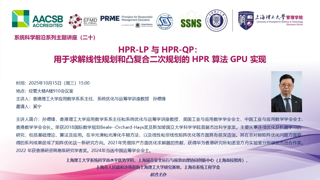 系统科学前沿系列主题讲座(二十):HPR-LP 与 HPR-QP:用于求解线性规划和凸复合二次规划的 HPR 算法 GPU 实现