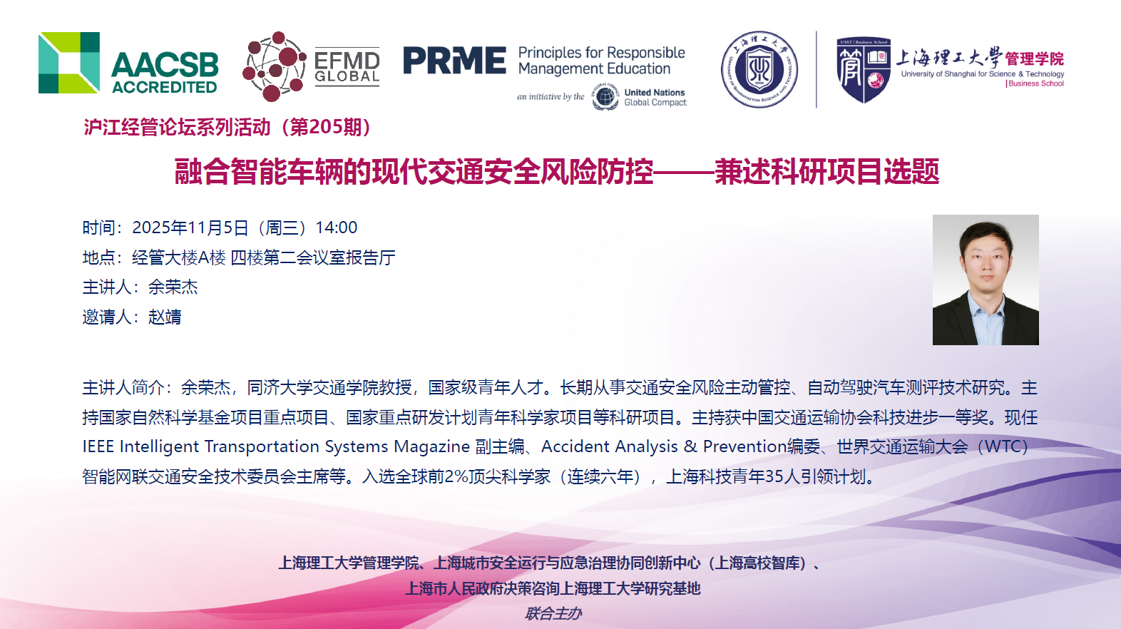 沪江经管论坛系列活动(第205期):融合智能车辆的现代交通安全风险防控——兼述科研项目选题
