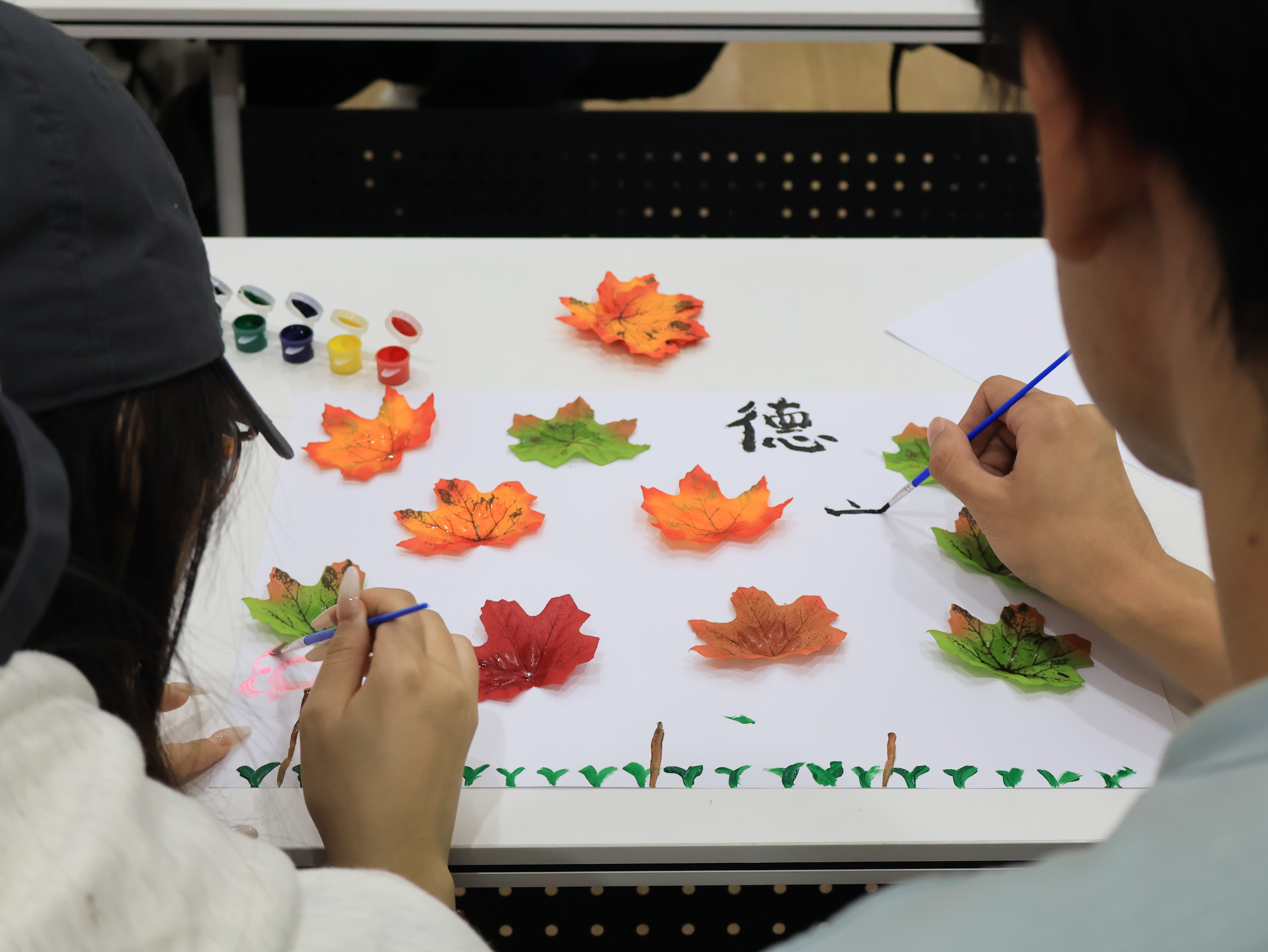 枫叶拼贴画环节堪称一场“美育+德育”的创意盛宴。同学们手持斑斓枫叶,或凝神构思,或巧手拼贴,将对“立德树人”的体悟化作一幅幅灵动作品——以叶脉纹理诠释品德的厚重,在德育滋养下逐梦长空。每一片枫叶的错落交织,都是青春与品德的对话,创意与情怀的碰撞。