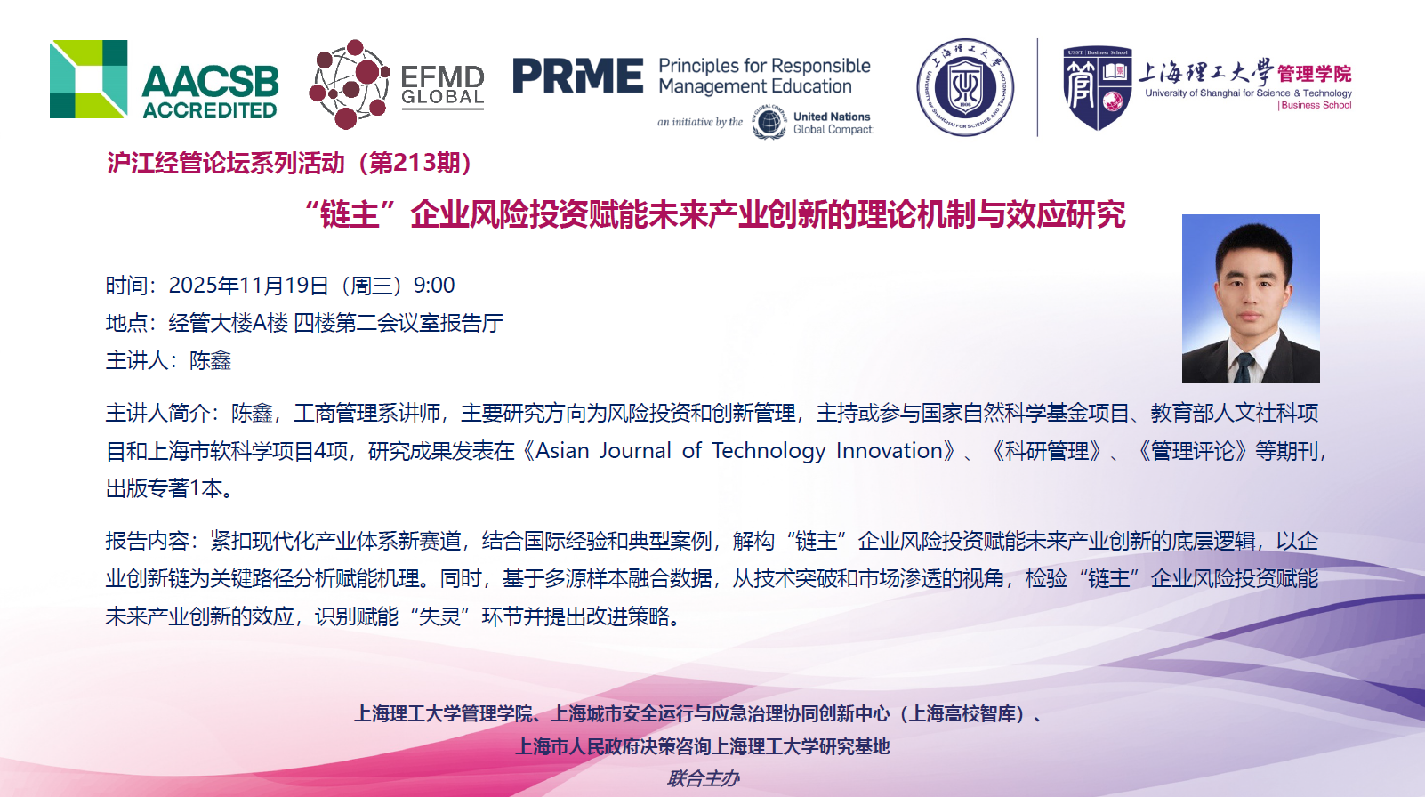 沪江经管论坛系列活动(第213期):“链主”企业风险投资赋能未来产业创新的理论机制与效应研究