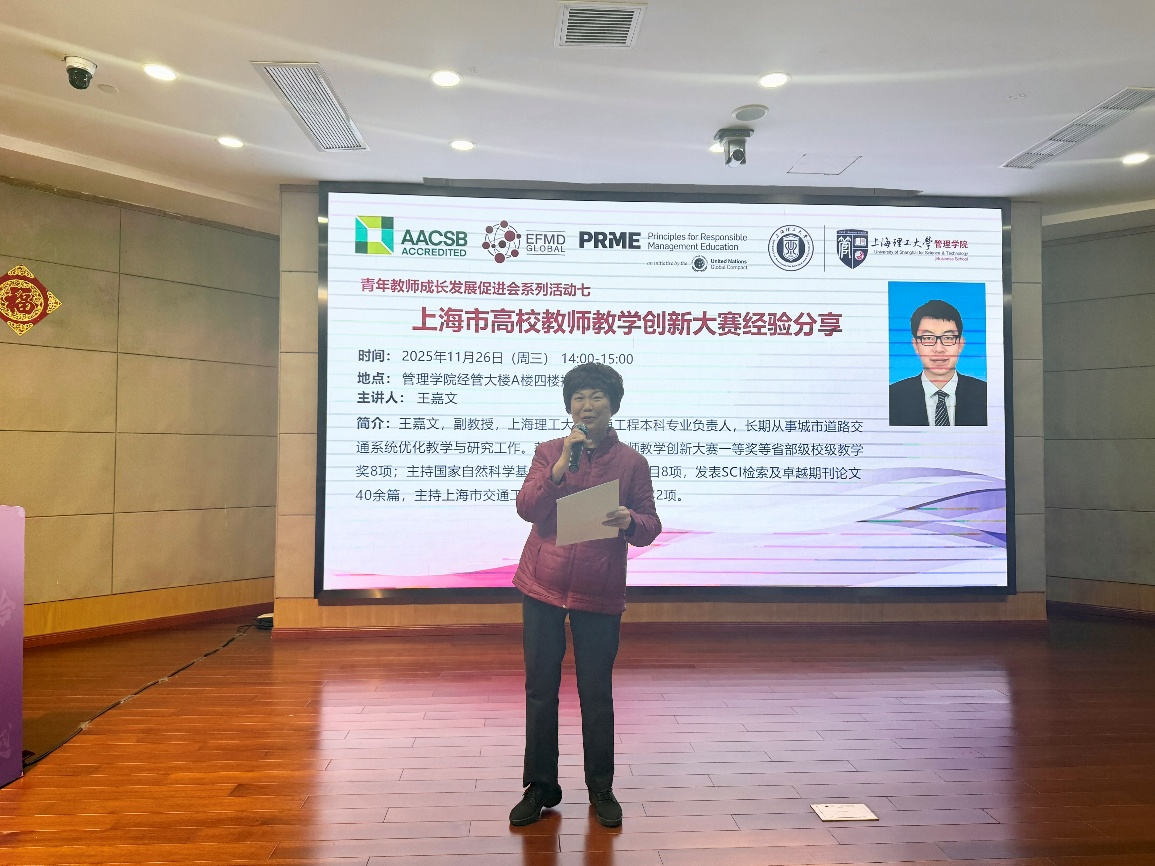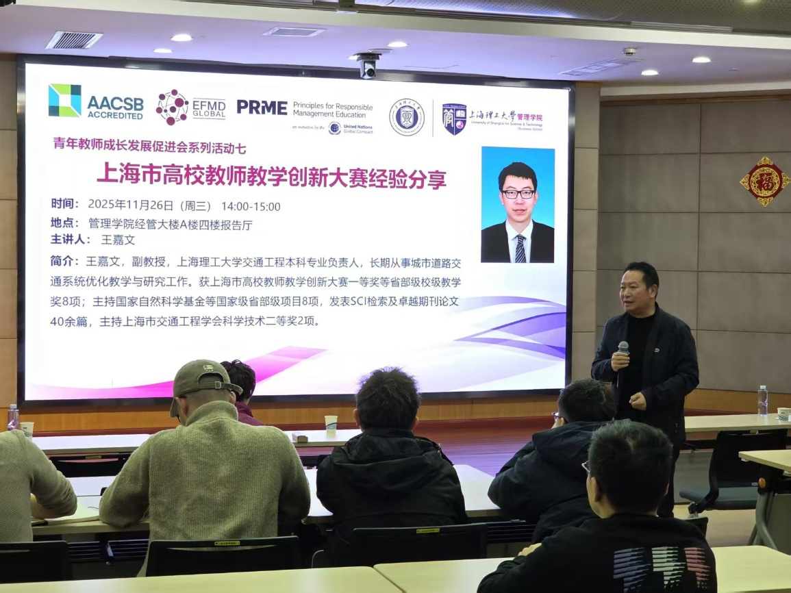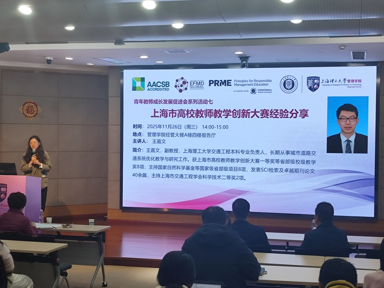 2025年11月26日,乐鱼网页版青年教师成长发展促进会2025年第七次活动在经管大楼A楼四楼报告厅举办。本次活动以“上海市高校教师教学创新大赛经验分享”为主题,旨在推广教学创新理念、分享实战经验,全面提升青年教师的教学创新能力和比赛竞争力。本次活动特邀交通工程本科专业负责人、交通系统工程系副系主任王嘉文担任主讲嘉宾,为全体青年教师分享其参加“上海市高校教师教学创新大赛”的宝贵经验。管理学院党委书记马静波、副院长房志明、青促会指导教师李正明以及学院青年教师参加了本次活动。讲座由工业与系统工程系青年教师吕可主持。