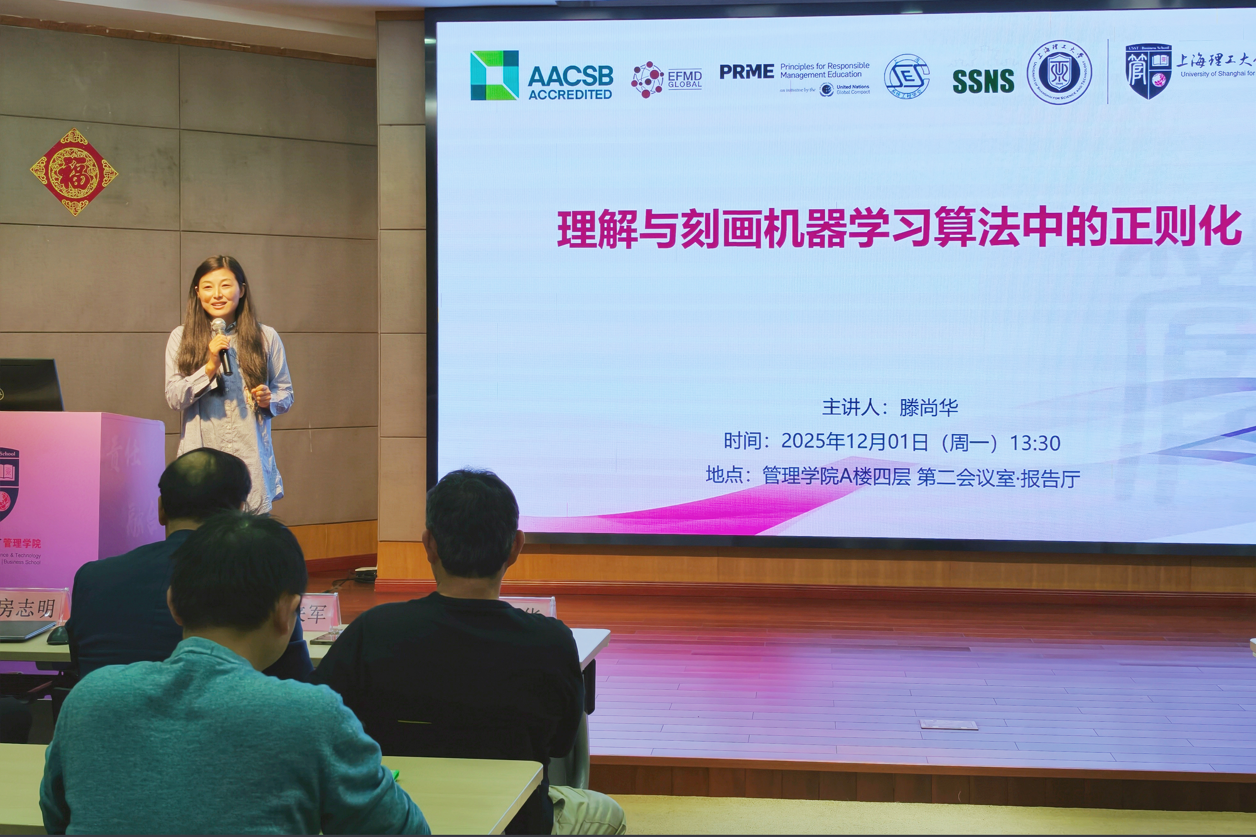 2025年12月1日,乐鱼网页版系统科学系举办系统科学前沿系列讲座第40场,特邀国际理论计算机泰斗、两届哥德尔奖得主、南加州大学滕尚华教授担任主讲,分享题为《理解与刻画机器学习算法中的正则化》的学术报告。管理学院院长赵来军教授、副院长房志明教授,系统科学系主任顾长贵教授,系统科学系教师盖玲、郑煜、卢科等参加报告会。本次讲座由盖玲主持,吸引了管理学院50多名师生积极参与。