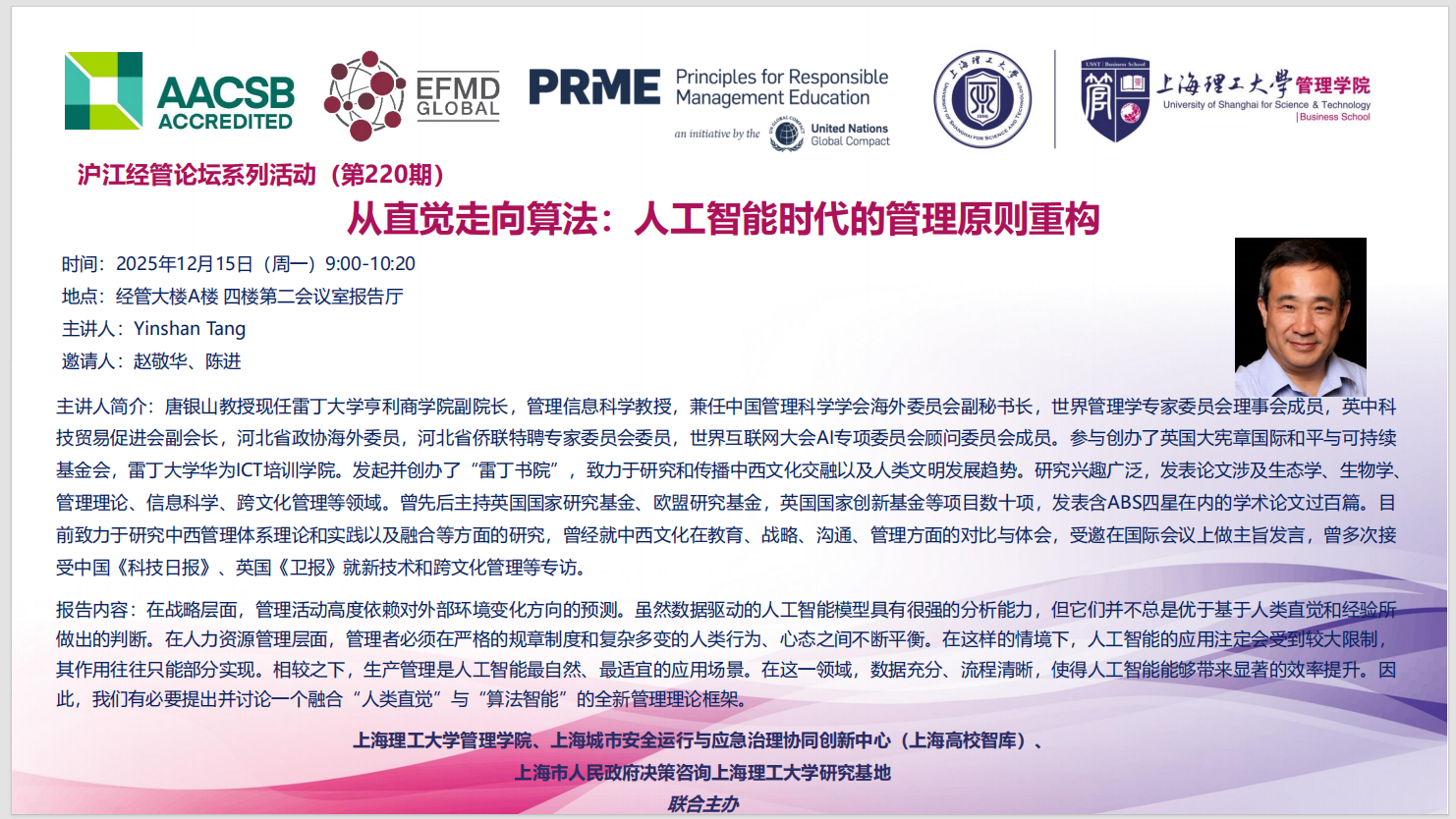 沪江经管论坛系列活动(第220期):从直觉走向算法:人工智能时代的管理原则重构