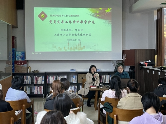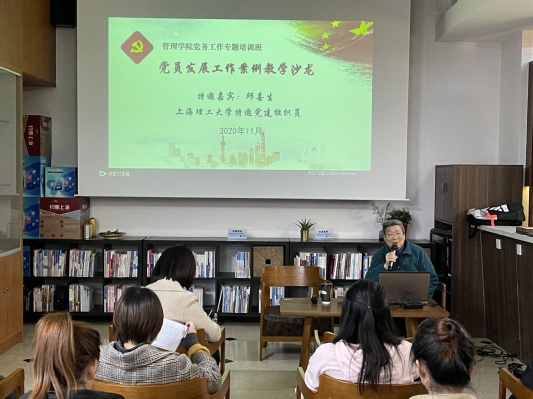 On the afternoon of November 27th, the case teaching salon of Party members' development work in the special training class of Party Affairs of The Business School was held at the 1906 Coffee Bar at the Cultural Wharf of The Business School. Pu Yingying, deputy secretary of the Party Committee of the College, Wang Qujian, full-time organizer, party branch secretaries, and branch committees attended this salon event. The Party Committee of the College invited Qiu Xisheng, the special party organizer of the University of Shanghai for Science & Technology, to give on-site case teaching.