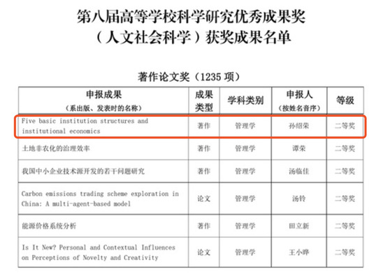 Recently ,the Ministry of Education announced the “The decision to reward the 8th Outstanding Achievement Award of Scientific Research in colleges (in the area of humanistic and social science)”.Through the judge by the expert ,the public informed and the deliberation of the award commitment and permission of the Ministry of Education, there are 1539 achievements has win the prize,among which there are 1241 win the publications reward which conclude 152 first prize ,783 second prize and 306 third price; 77 win the report of consultation ,which conclude 10 first prize ,47 second prize ,20 third prize ;20 win the popular prize ;201 win the youth achievement award.”Five basic institution structures and institutional economics”written by Sun Shaorong in our school wins the second prize ,which is the first winner in our school.