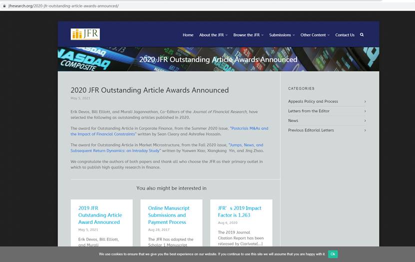 Xiao Yuewen, a young faculty published an article titled “Jumps, news, and subsequent return dynamics: an intraday study” in “Journal of Financial Research”, which is a reputable international journal in finance. Recently, the article has been announced by the journal as one of the two outstanding articles published in 2020.