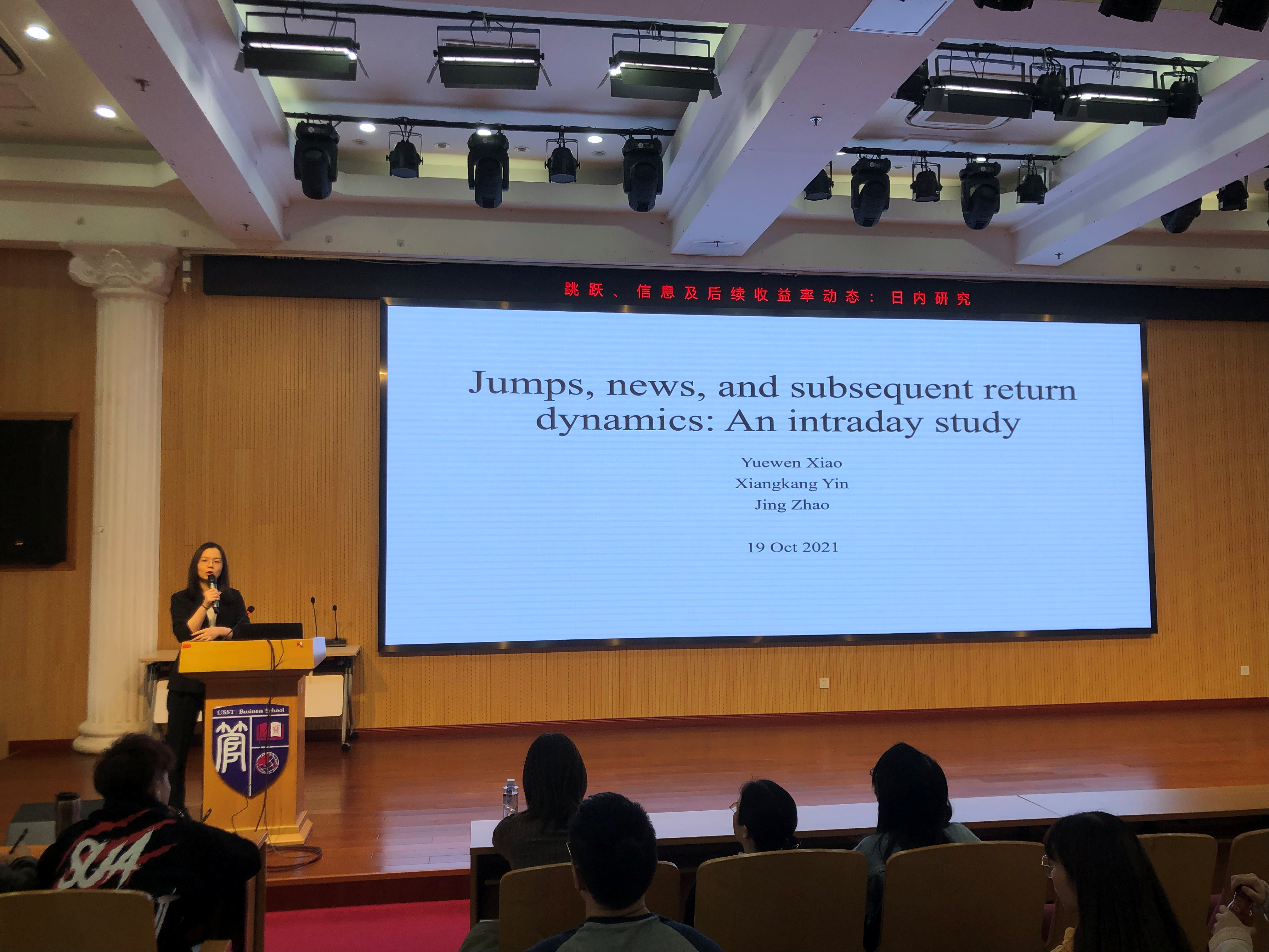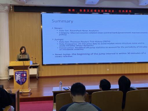 The empirical results show that the return rate reverses after the jumps without news, indicating that the jumps irrelevant to news about macroeconomy may reflect investors' overreaction and market friction. The post-jump return dynamics based on the news are related to the properties of news. In addition, whether related to news or not, the return reversal following the negative jump is stronger than that following the positive jump. After a detailed description of the paper, Dr. Xiao gave a concise summary about her study.