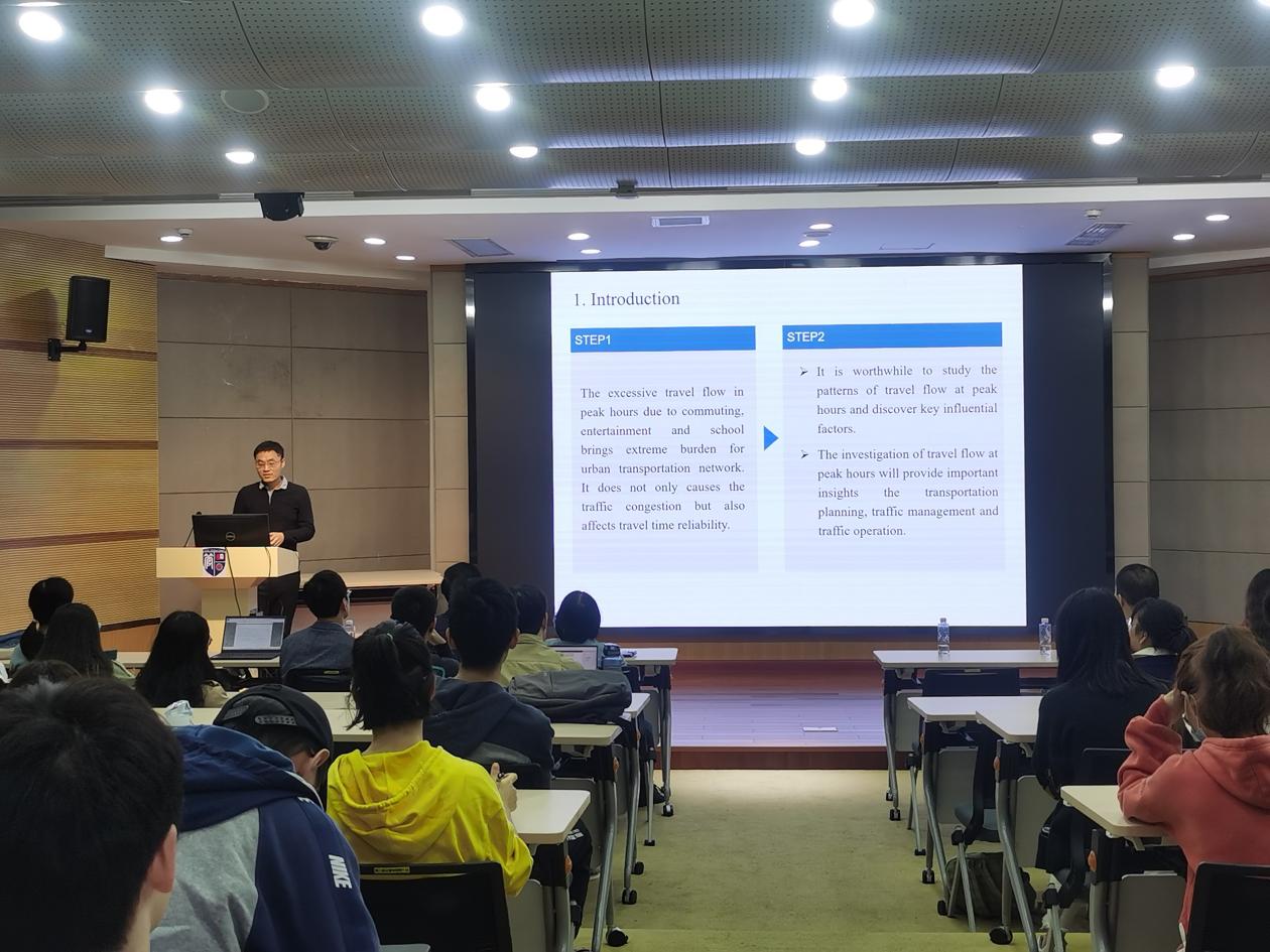 Next Dr. ZHOU Yiwei gave a lecture entitled A spatial model with endogenous weight matrix for investigating travel flow differences between peak hours with massive mobile phone data. Dr. Zhou first introduced the background of urban traffic flow analysis and pointed out that the current research has ignored the spatial effect and endogenous problem. Then, Dr. ZHOU elaborated on the selection of variables, theoretical modeling, and analysis of results to confirm the existence of endogenous spatial effects. He further pointed out that variables such as the number of office buildings and shopping malls have significant effects on the difference of traffic flow in morning and evening peak hours. He further conducted the relevant policy analysis based on the 14th Five-Year Plan of Hangzhou City. Finally, Dr. ZHOU summarized the shortcomings of the current research and gave an outlook on future research.