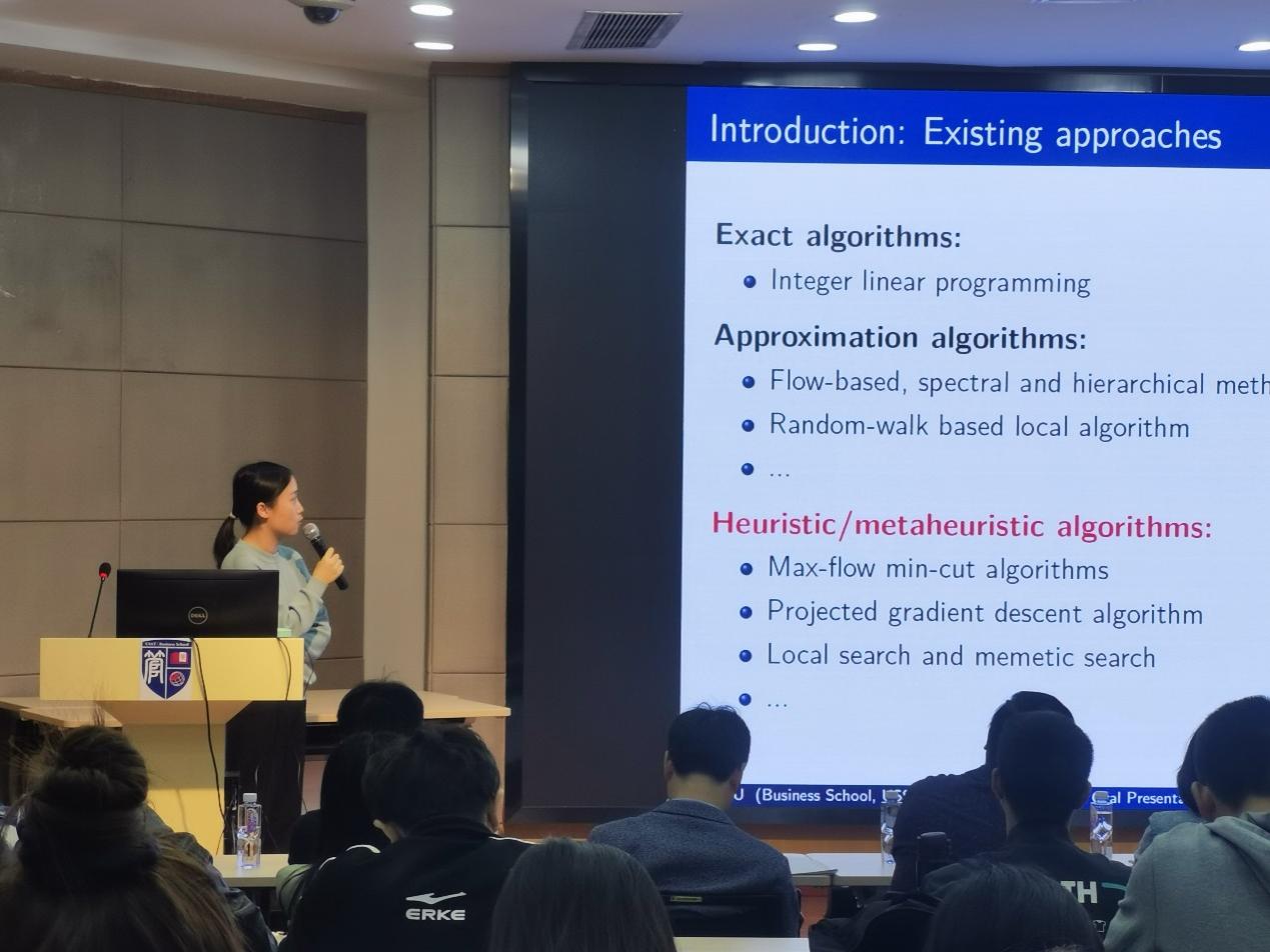 Before the lecture, Dr. HE Jianjia briefly emphasized the positive effect of such academic events on faculties and students to grasp the academic frontiers and improve research capabilities. Then, Dr. LU Zhi gave a lecture entitled Optimization approaches for minimum conductance graph partitioning. The speech began with an introduction of the NP-hard optimization problem and its background and an overview of the current research status and limitations. After that, Dr. LU introduced three types of optimization algorithms, and elaborated on the research framework, theoretical analysis, algorithmic challenges, and experimental analysis. Dr. LU further stated that theoretical analysis and algorithm design are the hot topics in the field of operational decision making and combinatorial optimization research. The latter combined with machine learning is gaining more and more attention. After a specific account of the study, Dr. LU gave a brief summary of her presentation and an outlook on future research.