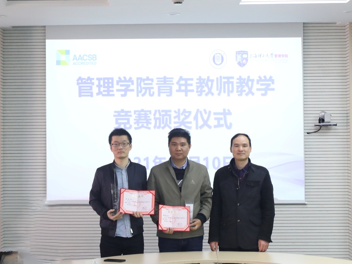 Prof. ZhANG Zheng introduced the processes and rules of the oung Faculty Teaching Competition, and announced the winners of the competition: WU Yan, SUN Yu, HUANG Zhongyi won the first prize, TAO Xiangming, HUANG Jing, XU Jiawen won the second prize, YANG Le, CHEN Mingli won the third prize. He encouraged the winners to make more efforts to strengthen basic teaching skill training and bold innovation, to develop some distinctive golden class WANG Wei, ZHANG Zheng and SHU Yiming presented the first, second and third prizes respectively to the winners.