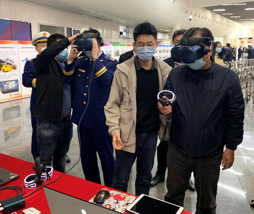 Relying on the Public Safety System Laboratory of the Department of System Science, Prof. FANG Zhiming's team is responsible for the research and development of Intelligent Fire Fighting and Trigeminy Mechanism application services. It includes the VR-based Shanxi South Road metro station evacuation platform, which flexibly builds emergency evacuation scenarios by controlling the form of inflowing information and features of different types of emergencies, and is an efficient fire safety publicity and training tool. The intelligent evacuation strategy generation system has been developed to form real-time and dynamic evacuation strategies according to real-time passenger flow data of metro stations and on-site emergencies. Intelligent evacuation indicator lamps have been developed, including portable emergency evacuation indicator card and intelligent evacuation indicator terminal. The dynamic evacuation strategy is transformed into the control signal of the evacuation indicator lamps to realize the dynamic guidance of passengers. That day, the team, invited by Shentong Metro Co., LTD, took VR evacuation platform, evacuation strategy generation system, intelligent evacuation indicator lamps and so on to participate in the activity and made a live demonstration.