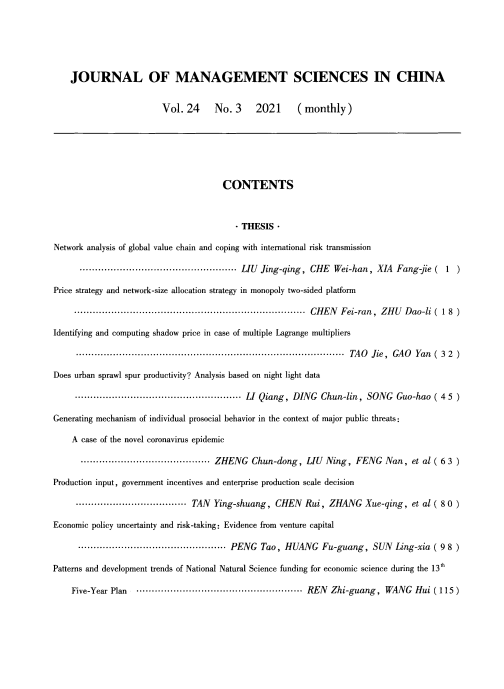 Recently, the paper Identifying and computing shadow prices in case of multiple Lagrange multipliers, co-authored by Tao Jie and Gao Yan in the business school of USST, was published in the Journal of Management Science in China (JMSC). The JMSC is recognized as an authoritative journal in management science in China, and it is also a Class A journal among the TOP journals of the business school.