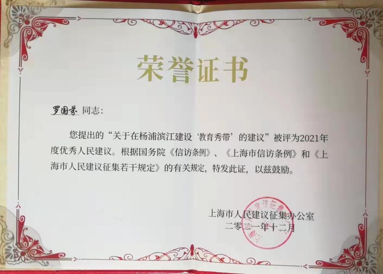 In accordance with the relevant provisions of the regulations of the State Council on letters and visits, the regulations of Shanghai Municipality on letters and visits and the provisions of Shanghai Municipality on the collection of people's suggestions, the Shanghai Municipal People's suggestion collection office issued the honorary certificate and trophy of Shanghai excellent people's suggestion in 2021 to Comrade LUO Guofen. Dr. LUO Guofen was also invited to present awards to the winners as an awarding guest.