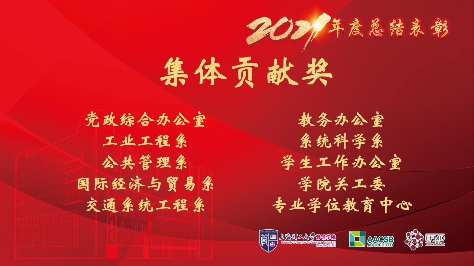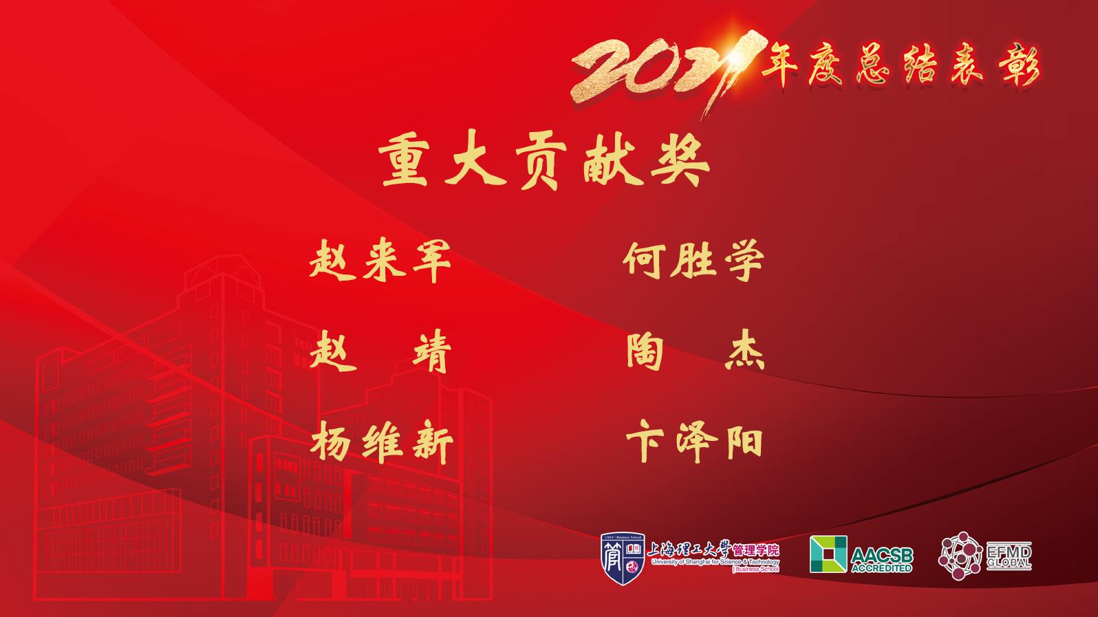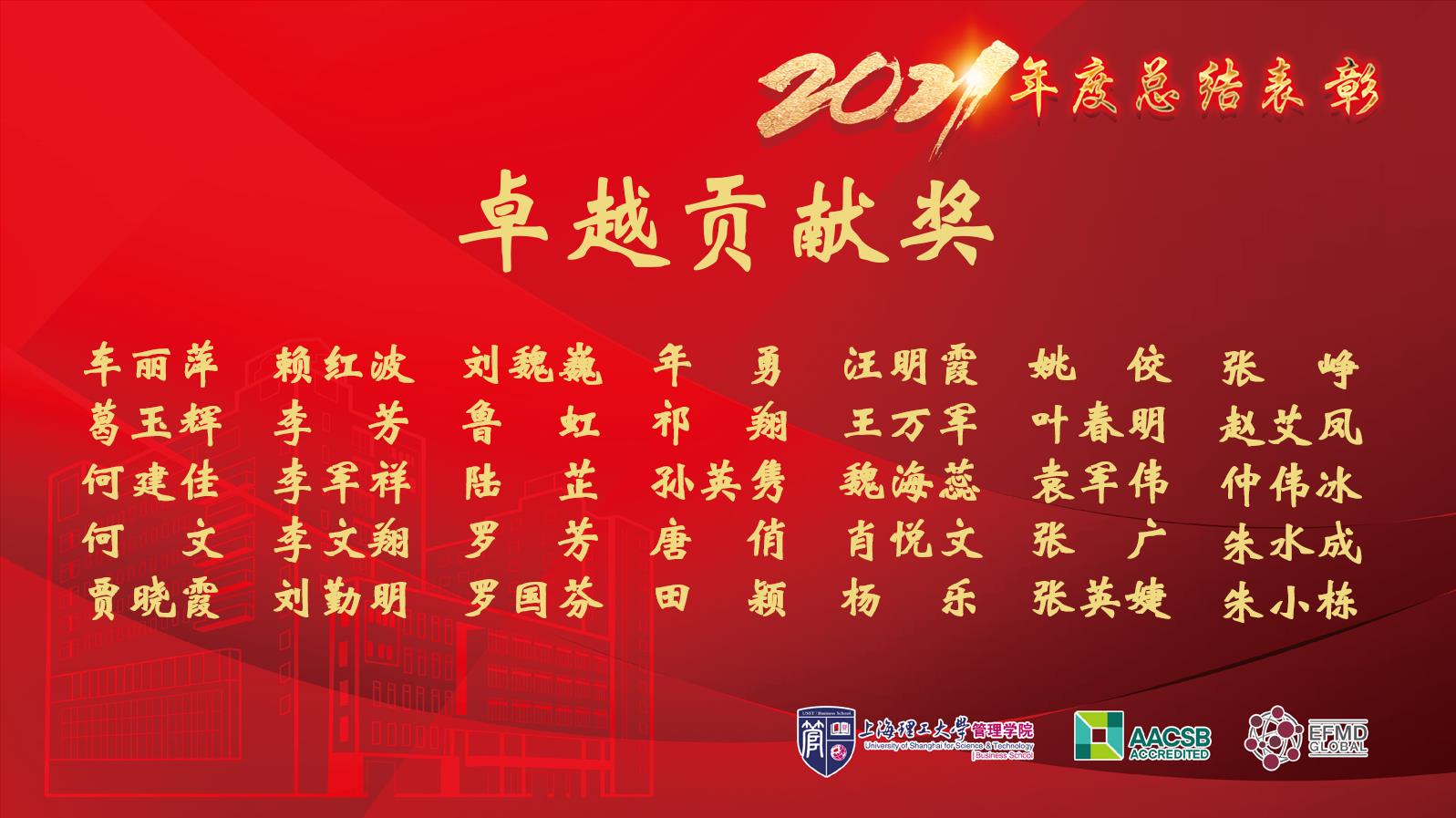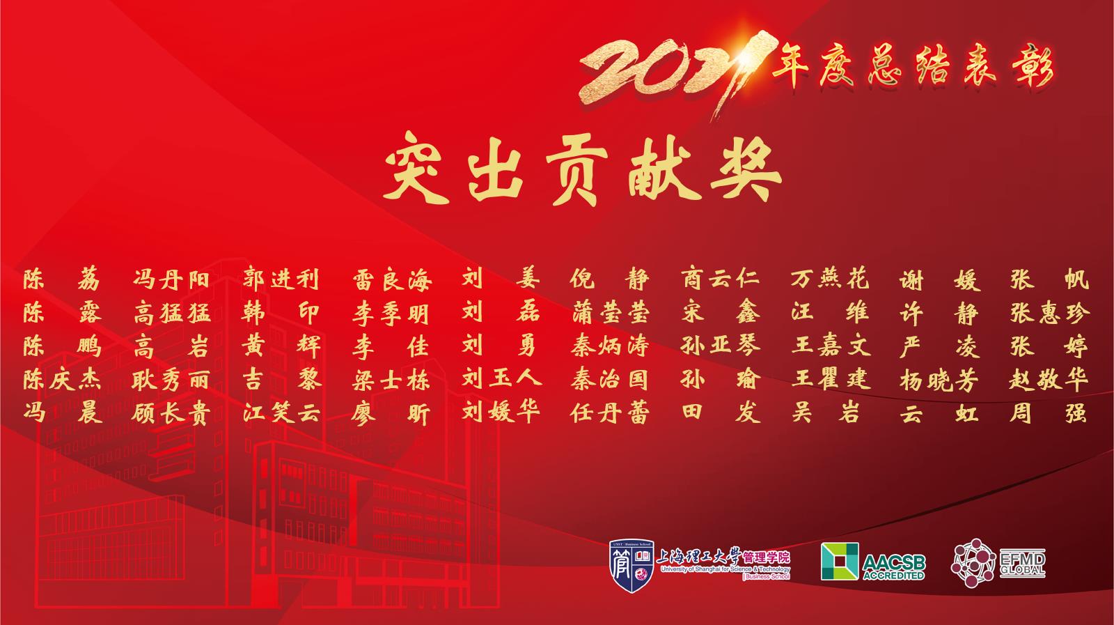 2021 is an extraordinary year, it is the 115th anniversary of the founding of USST and the 15th anniversary of the new business school. Summing up the past and looking forward to the future, all members from business school have not forgotten their original heart, kept their mission in mind, overcome difficulties, climbed to new heights and achieved fruitful results. In order to commend the advanced collectives and individuals who have made outstanding contributions to the development of the school in the past year, call on all faculties and students of the school to learn from the advanced collectives and individuals, faithfully fulfill the original mission of educators to educate students for the Party and the country, and help the development of the school to a new level, the school awarded outstanding contribution award to 50 faculties including CHEN Li, etc. The collective contribution award was awarded to 10 departments including the general office of the Party and government, the excellent contribution award was awarded to 35 faculties including CHE Liping, and the major contribution award was awarded to 6 faculties including ZHAO Laijun, ZHAO Jing, YANG Weixin, HE Shengxue, TAO Jie and BIAN Zeyang.