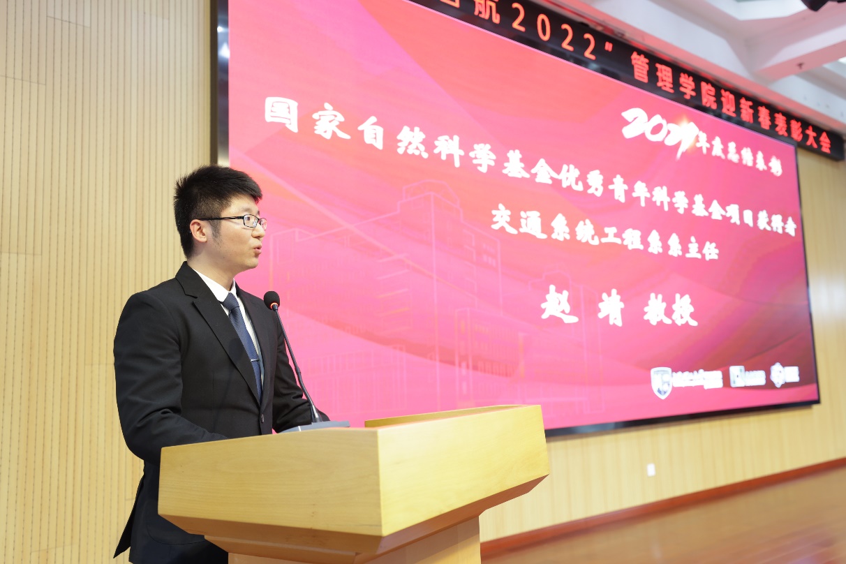 Professor ZHAO Jing, the recipient of the excellent youth science fund of the National Natural Science Foundation of China and the head of the department of transportation system engineering, as the representative of the award-winning faculty, delivered the award-winning speech with the three keywords of thanks, feelings and perception. He expects that in 2022, all faculties of the school will uphold the fine tradition of cohesion and forging ahead of the business school and the development idea of walking with the times and running fast in small steps, strive to build a first-class university of science and engineering with remarkable characteristics.