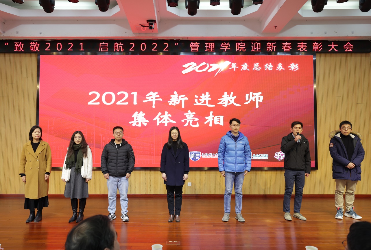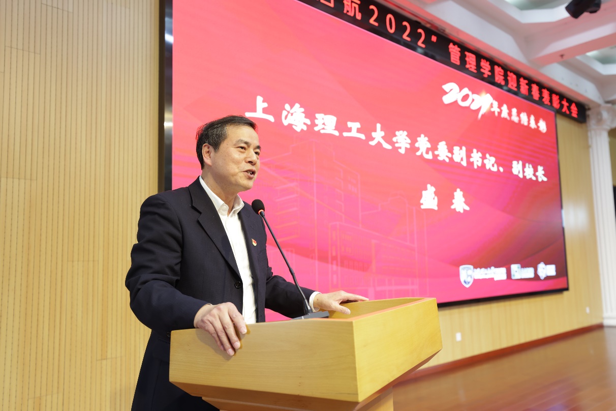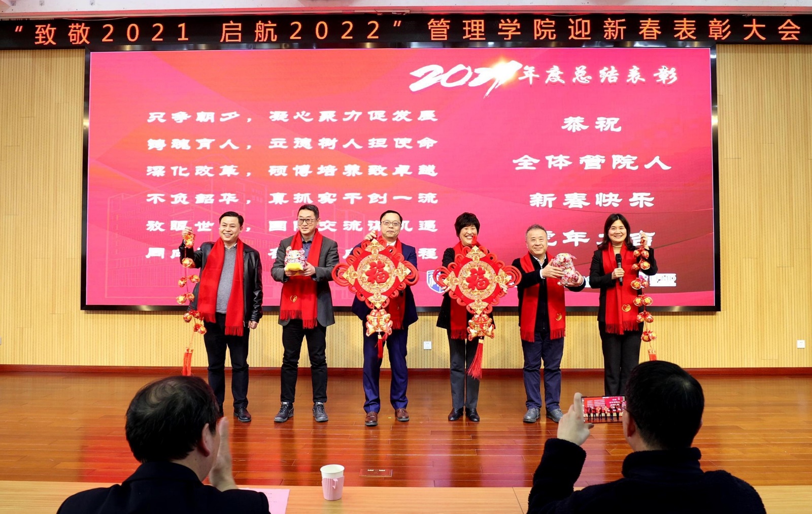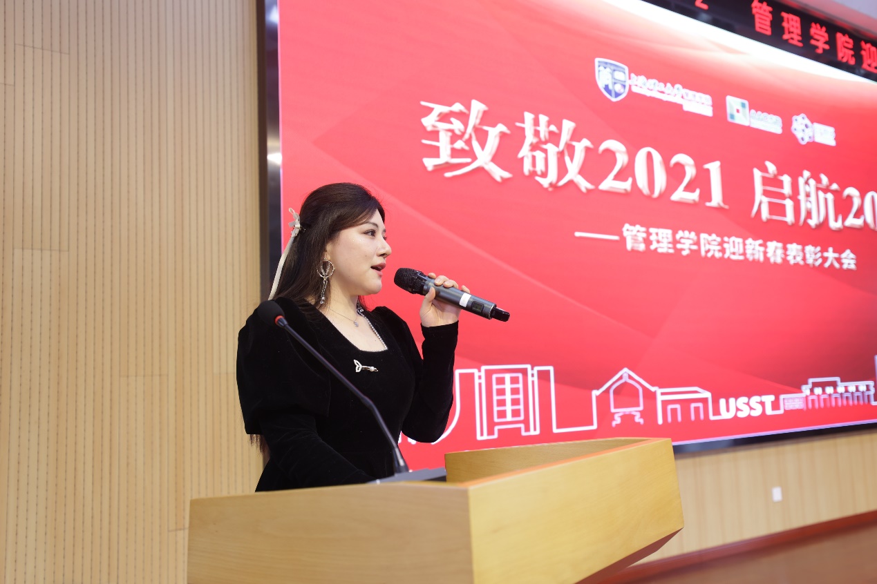 On the afternoon of January 19, the business school new year commendation meeting was grandly held in conference room 1, Building A of Economy & Management Building. SHENG Chun, deputy secretary of the Party committee and vice president of USST, YE Lei, head of the publicity department of USST, DU Hanrong, general manager of Qimen black tea company, and all members of the leadership lineup and faculty representatives of the school attended the meeting. The meeting was presided over by FEI Chen, a young faculty from the department of system science.