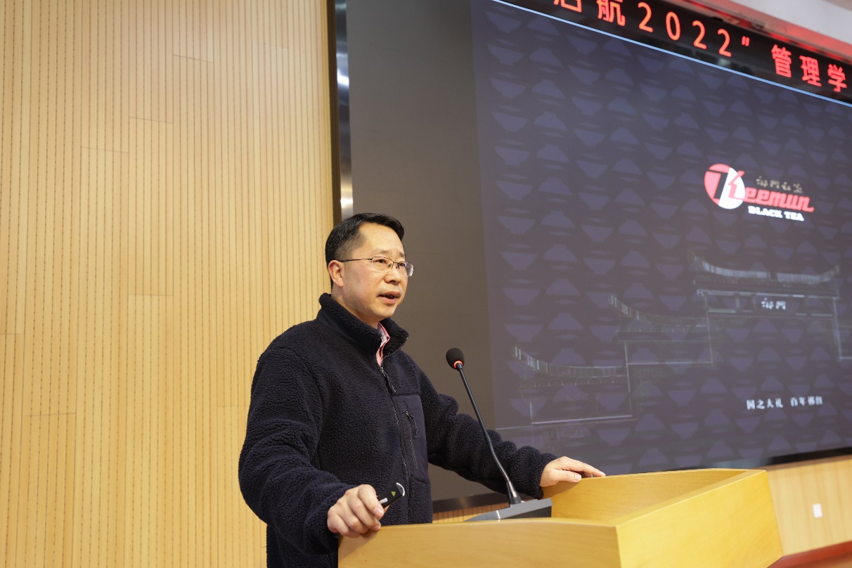 The development of the school is inseparable from the strong support of alumni enterprises. After the commendation, DU Hanrong, general manager of Qimen black tea company, the sponsor of the meeting, shared his experience as a visiting professor of the business school and the historical origin of Qimen black tea and Hujiang business school. At the same time, he hoped to promote the common growth of the school and enterprises through university enterprise cooperation.
