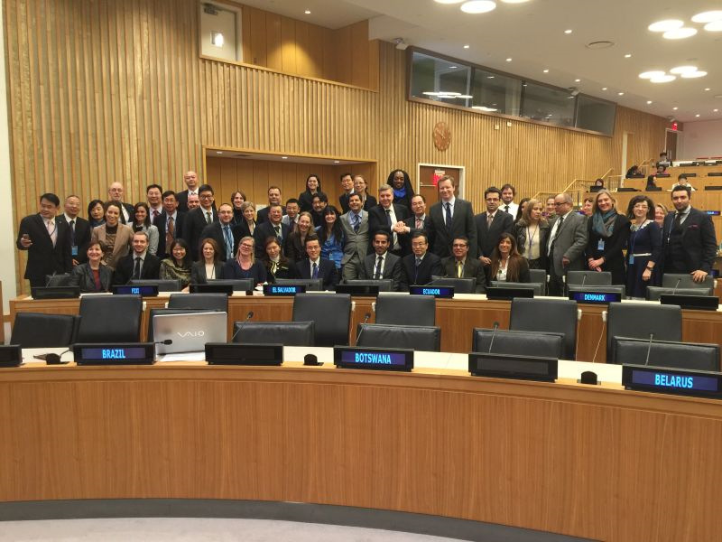 Group photo of some representatives of UNCITRAL working group III (Online Dispute Resolution) after the adoption of the document Technical Notes of the United Nations Commission on International Trade Law on Online Dispute Resolution (the third person from the right in the front row is Professor YANG Jianzheng)
