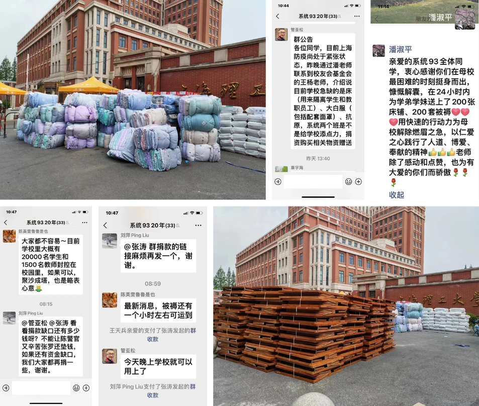 Learning of the shortage of epidemic prevention materials in the university and communicating with the head teacher Pan Shuping about the most urgent needs, the alumni of Year 93 majoring in System Engineering actively donated money and materials under the organization of the monitor Guan Yasong. Alumna Chen Meiwen assisted in finding the supply and organizing the delivery. The majority of alumni and alumni enterprise (Li Zhuo) Shanghai Jiaming Machinery Co. Ltd. donated a total of 200 beds and 200 sets of three-piece bedding. At the critical moment, they stepped forward, acted quickly and delivered the stuff within 24 hours, expressed their concern and support for the university and solved the urgent needs of the university.