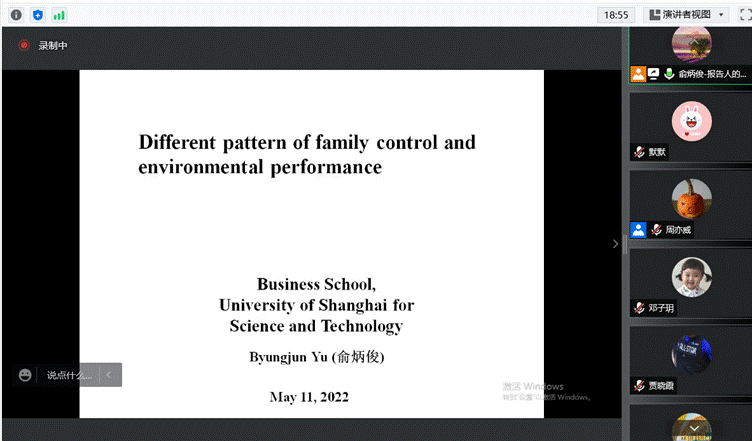May 11th, the 25th event of Academic series of Hujiang Economy & Management symposium of Business School was hosted at VOOV meeting (ID: 300-922-928), YU BYUNGJUN (俞炳俊), Ph.D in Business administration and Lecturer of Department of Business Administration, presented “Different control pattern of family firms and its environmental performance, Zhou Yiwe, Lecturer of Department of Information Management and Information System, served as appraiser.