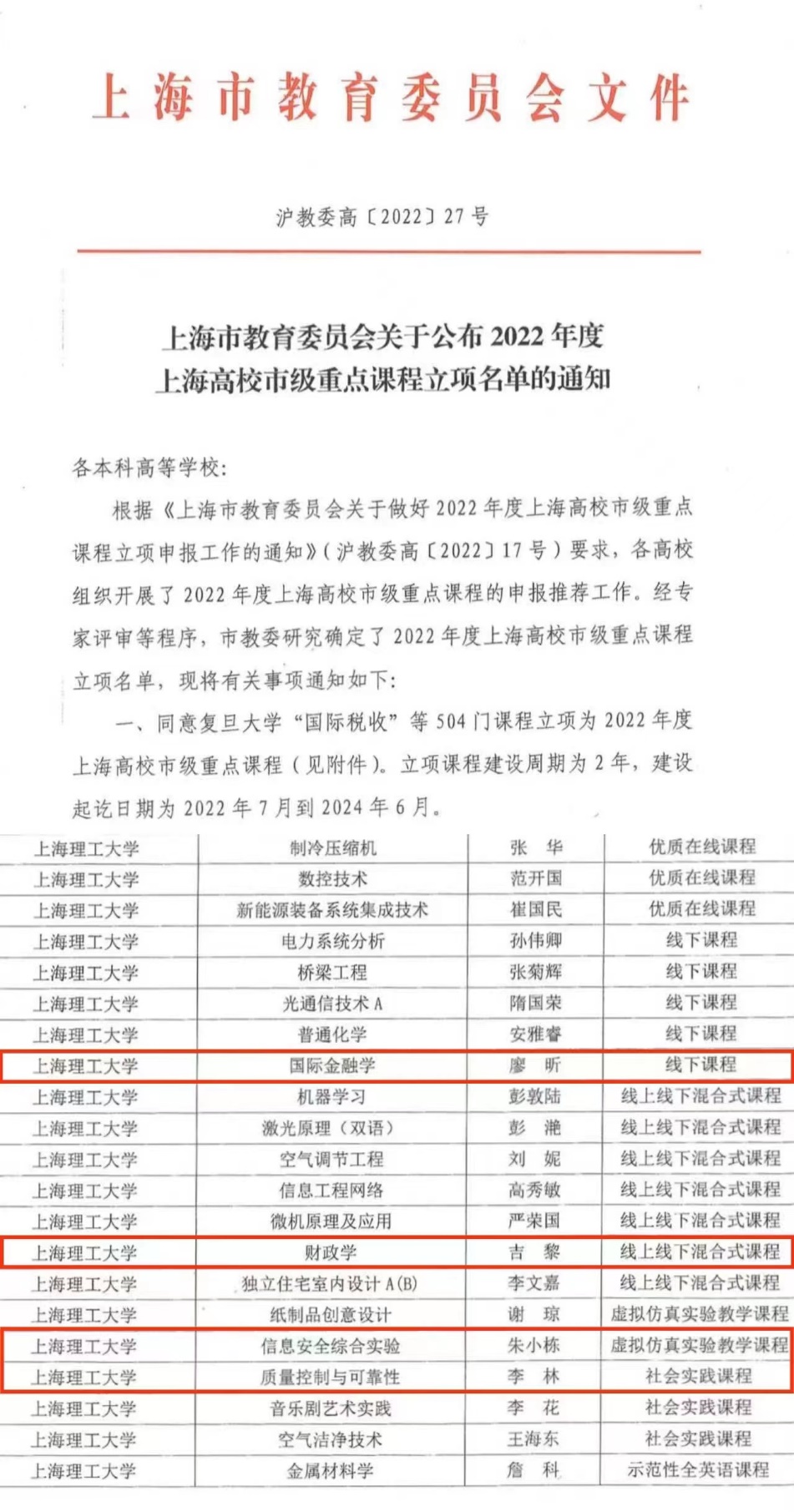 Recently, Shanghai Municipal Education Commission released the Notice of Shanghai Municipal Education Commission on Announcing the List of Municipal Key Courses in Shanghai Universities in 2022, and four undergraduate courses of our school were awarded the Municipal Key Courses in Shanghai Universities in 2022. This is the largest number of municipal-level key courses ever awarded to our school, and also fills the gap of our school in municipal-level social practice courses. The specific list is as follows.