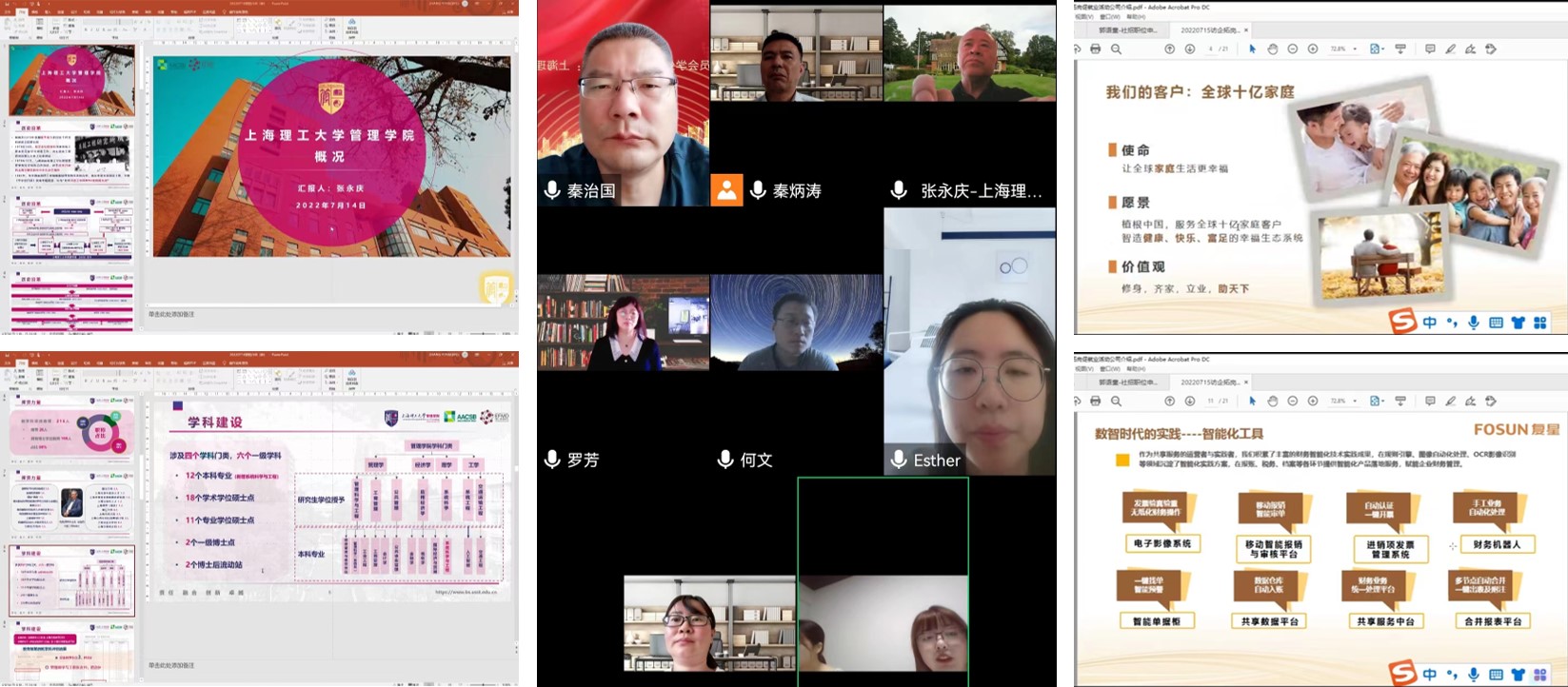 On July 15, Business School and Fosun Financial Shared Service Center held an online meeting. Zhang Yang, Senior Director of Human Resources and CHO of Fosun Financial Shared Service Center, Zhou Hui, Senior Manager of Human Resources, Peng Yuting, Financial Audit Specialist and alumnus of Business School Class of 2020, Zhang Yongqing, Deputy Dean of Business School, Luo Fang, Director of the Department of International Economics and Trade, Qin Bingtao, Deputy Director, He Wen, Secretary of the Party Branch, Qin Zhiguo, Director of the Student Work Office, and Jiang Xiaoning, Leader of the Graduation Class of 2023, attended this meeting. The meeting was chaired by Prof. Luo Fang.