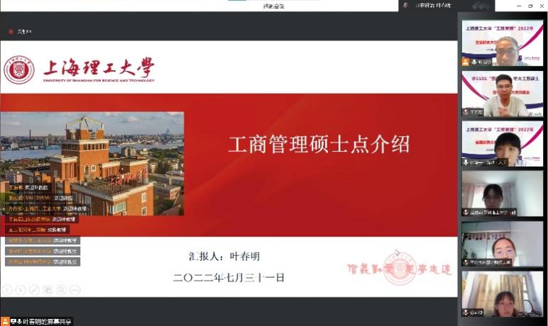 In the afternoon of July 31, 2022, Business School of University of Shanghai for Science and Technology (USST) successfully held the 2022 National Summer Camp for Outstanding Students in Business Administration using Tencent Meeting. Professor Sun Shaorong, a famous scholar of USST, Professor Ye Chunming, the leader of the first-level discipline of business administration and the director of MEM program, Professor Ge Yuhui, director of the Department of Business Administration and the executive deputy director of EDP Center, Dr. Chen Zhiyong, the deputy director of the Department of Accounting, Dr. Tian Ying and Dr. Zhang Kai of the Department of Business Administration, Dr. Wang Wanjun of the Department of Accounting and other teachers' representatives, as well as nearly 80 students from various universities including “211” and “985” project universities across China attended the camp. The summer camp included an introduction of the school, detailed introduction of the disciplines, introduction of each department, reports on the frontiers of the disciplines, and face-to-face interaction. The atmosphere was warm and active!