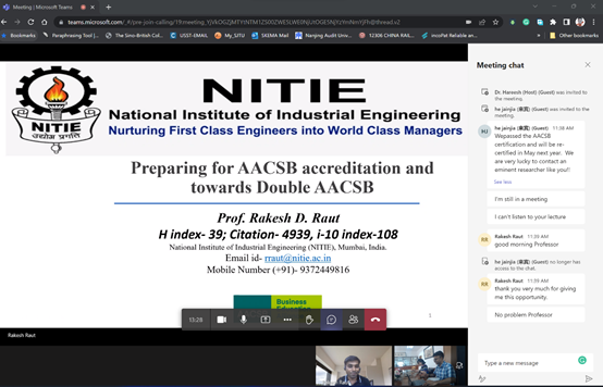 Business school invited renowned Prof. Rakesh D. Raut from the National Institute of Industrial Engineering (NITIE), Mumbai, India, towards an open exchange and discussion on-line about AACSB review preparation in the afternoon of September 17, 2022. The event was hosted by Indian teacher Dr. Hareesh. Present at the event were Professor He Jianjia, vice dean of Business School, Dr. Wang Yaopeng, Dean’s Assitant, Ms. Zhong Weibing, Director of the Internationalization Development Office, and members of the Internationalization Development Office.