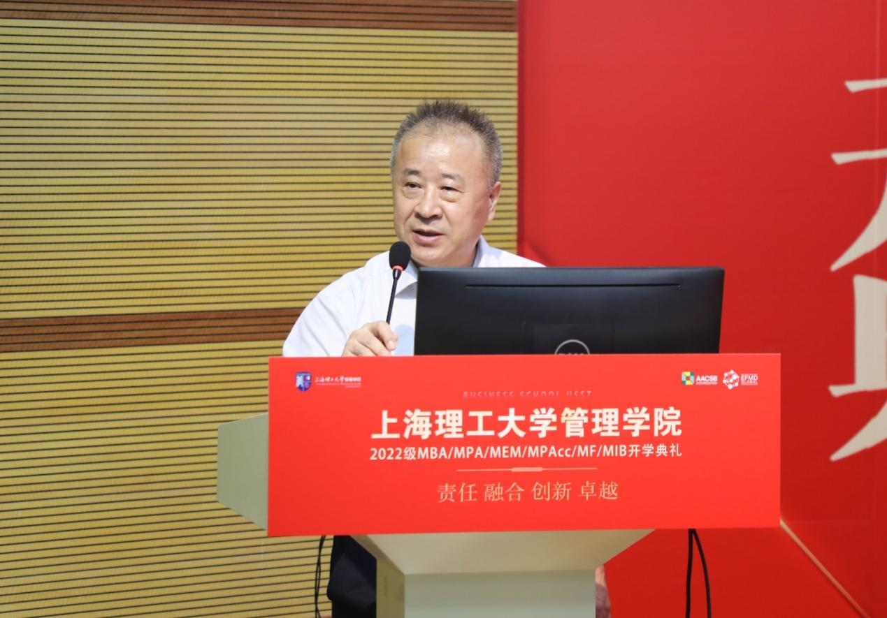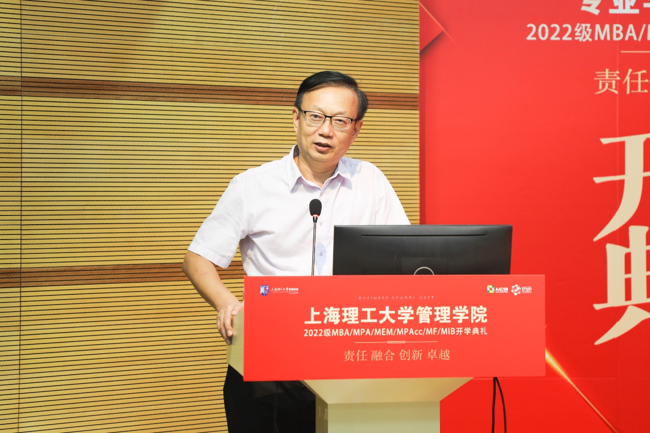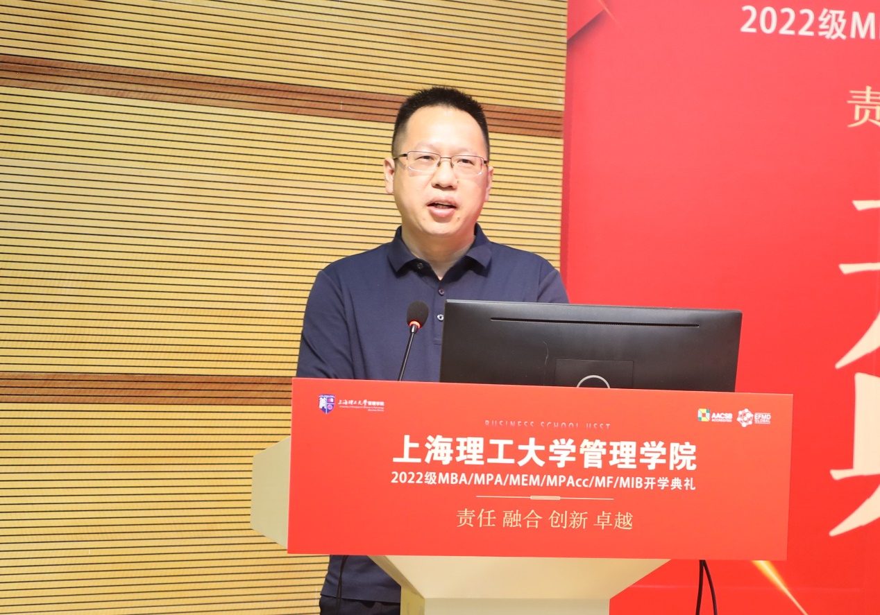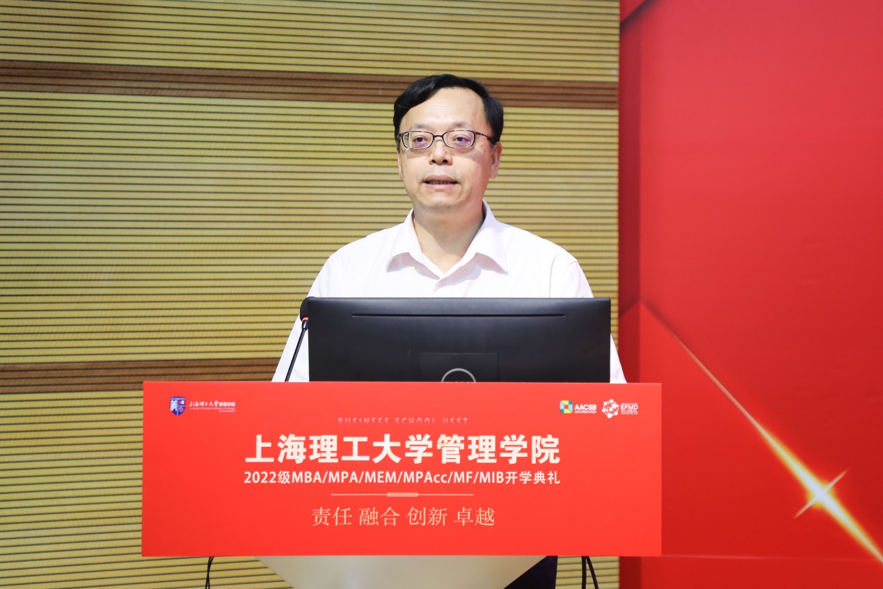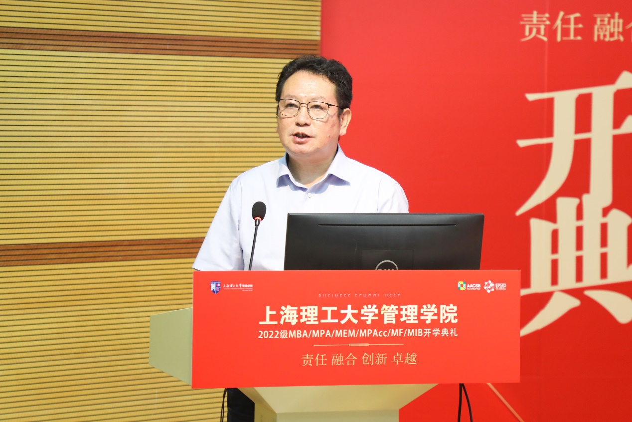 Dean Zhao Laijun delivered the first speech representing the Business School. On behalf of all the faculty and students in the Business School USST, he extended a warm welcome and congratulations to the new students of the Class of 2022. In his speech, Dean Zhao introduced that the total number of enrollment of MBA/MPA/MEM/ MPAcc/MF/MIB (6M) in the Professional Degree Education Center of the Business School is at a record high this year. He systematically reviewed the 100-year history of development in business education in the Business School, as well as the positioning of the Business School, including its objectives, core values, departmental specialties and talent cultivation goals.