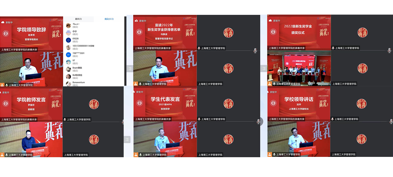 In the afternoon of September 3, the Business School USST held the opening ceremony for the new students of MBA, MPA, MEM, MPAcc, MF and MIB of class 2022 both online and offline. The main offline venue was located in the second meeting room on the fourth floor of Building A in Business School. Vice President, Prof. Liu Ping, Vice Executive President of Graduate School, Prof. Cui Minguo, Dean of Business School and Director of Professional Degree Education Center, Prof. Zhao Laijun, Secretary of Party Committee of Business School, Prof. Ma Jingbo, Vice Dean and Deputy Director of Professional Degree Education Center, Prof. Zhang Yongqing, Vice Dean and Director of MBA Program, Prof. Zhang Zheng, Vice Dean and Deputy Director of MBA Program, Vice Dean, Prof. He Jianjia, Vice Dean and Deputy Secretary of Party Committee, Prof. Pu Yingying, and Director of MPA Program, Prof. Che Liping, Director of MEM Program, Professor Ye Chunming, Deputy Director of MPAcc Program , Associate Professor Yu Qianlong, Director of MF Program , Professor Gao Guangkuo, teachers' representatives, and all teachers of Comprehensive Office of Professional Degree Education Center attended the ceremony in the main hall. The new students of the 2022 MBA, MPa, MEM, MPAcc, MF and MIB participated in the opening ceremony online and offline. The opening ceremony was hosted by Vice Dean Zhang Yongqing.