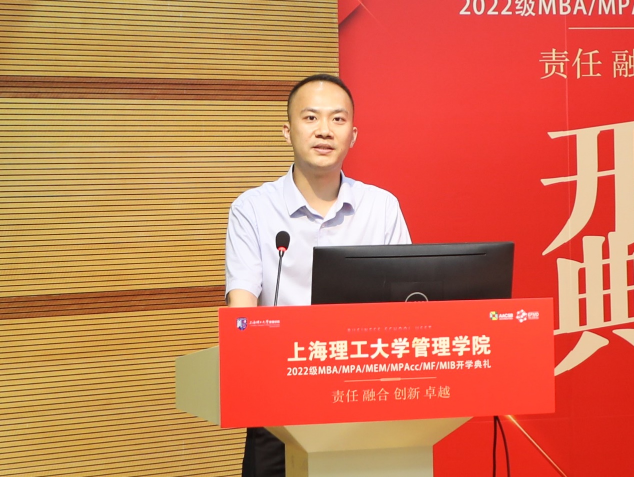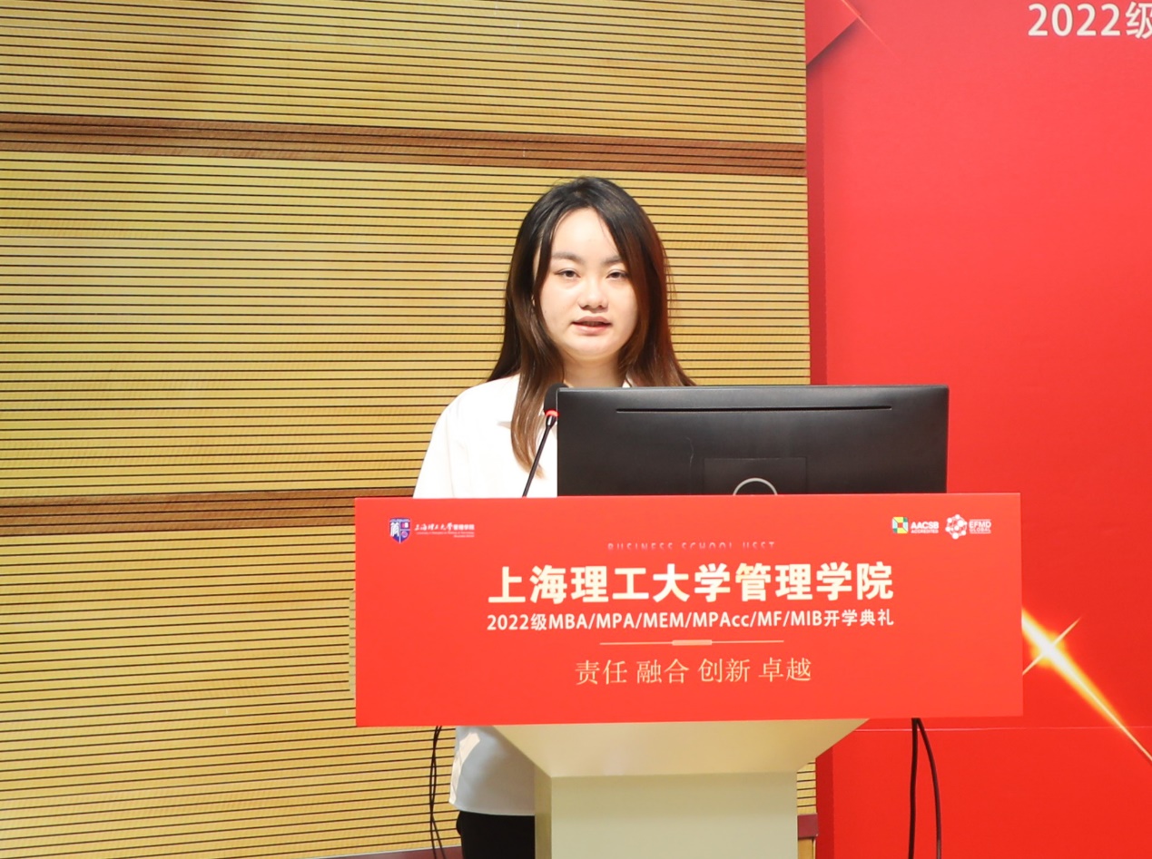 The Associate Professor Luo Guofen from the Department of Public Administration, as a representative of the faculty, warmly welcomed the new students of the 2022 Class of 6M professional degree, congratulating them on entering this beautiful campus with rich history and joining the flourishing family of the Business School. Dr. Luo instructed the new students that on-job-learning is hard and such learning opportunities are extremely precious. He hoped that students should master the systematic thinking method, learn to coordinate and balance all the tasks, do a good job of time management, condense the research questions that need to be addressed, cherish the time and challenge themselves. Finally, Dr. Luo sincerely wished the students to become a brave explorer and a good innovator, to have a positive mind and a strong body, to become a managerial personal full of positive energy, and to be an excellent alumnus that USST can be proud of.