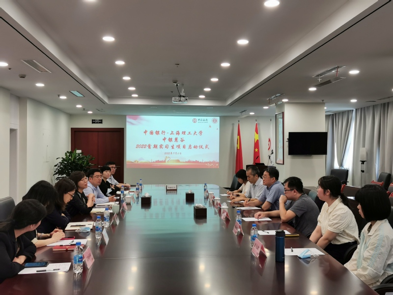 On September 6, Zhang Zheng, deputy dean of the Business School, finance dean Zhang Qinglong, young teacher Su Xiaoshan led students to the Bank of China(BOC) Yangpu branch, at the University of Shanghai for Science and Technology and the bank of China to build fusion base of BOC Hui Gu 2022 first intern project launch ceremony, the Bank of China Yangpu branch deputy president Lu Ying, Jia Haohao, assistant governor, administrative institutions, Liu Qin, deputy director of the administrative institutions department, Zhang Weilin, director of the personal finance department, Wang Jingru, director of the company's finance department, Yang Yuwen, director of the transaction banking department, and Ouyang Tingting, director of the operation center and the bank of China leading experts attended the launch ceremony. Director Liu Qin presided over the launch ceremony.
