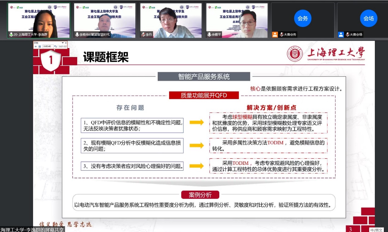 In order to promote the integration of industry and education, the collaborative education of industrial engineering majors, strengthen the understanding and application of industrial engineering professional knowledge among college students, promote the improvement of college students' overall quality and the cultivation of their innovative spirit and practical ability, and deepen the education and teaching reform of industrial engineering courses, under the guidance of the Industrial Engineering Teaching Steering Committee of the Ministry of Education, the Industrial Engineering Branch of the Chinese Mechanical Society, the Shanghai Society of Mechanical Engineering, the Shanghai Society for Management Sciences, the Industrial Engineering Professional Committee of the Shanghai Society of Mechanical Engineering, the Logistics and Supply Chain Management Professional Committee of the Shanghai Society for Management Sciences, The Business School of University of Shanghai for Science and Technology jointly held the 7th Shanghai Undergraduate Industrial Engineering Application and Innovation Final. The final was held in the cloud (online) on September 24th under the influence of the epidemic.