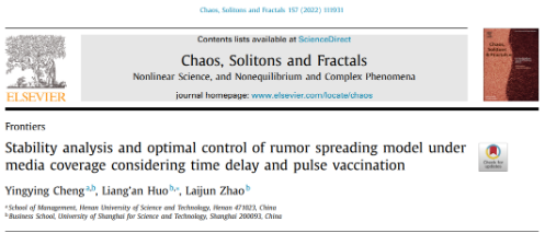 Cheng Yingying published a paper entitled "Stability analysis and optimal control of rumor spreading model under media coverage considering time delay and pulse vaccination", which constructs an improved rumor propagation model by comprehensively considering the time delay effect and media reporting factors. The popular science education is introduced into the rumor propagation process as a periodic pulse, and the optimal control problem under pulse inoculation is designed to minimize the scale and control cost of rumor propagation. Cheng Yingying is the first author of the paper, her supervisor Professor Huo Liang’an is the corresponding author, and Professor Zhao Laijun is the co-author.