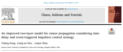 Dong Yafang published a paper entitled "An improved two-layer model for rumor propagation considering time delay and event-triggered impulsive control strategy", which constructs a two-layer model considering the time delay effect XYZ−ISR to describe the dynamic propagation process of rumors in multiple channels. An event-triggered pulse control strategy is proposed to effectively control the spread of rumors, and finally some interesting results are obtained through numerical simulation and case verification. Dong Yafang is the first author of the paper, her supervisor Professor Huo Liang’an is the corresponding author, and Professor Zhao Laijun is the co-author.