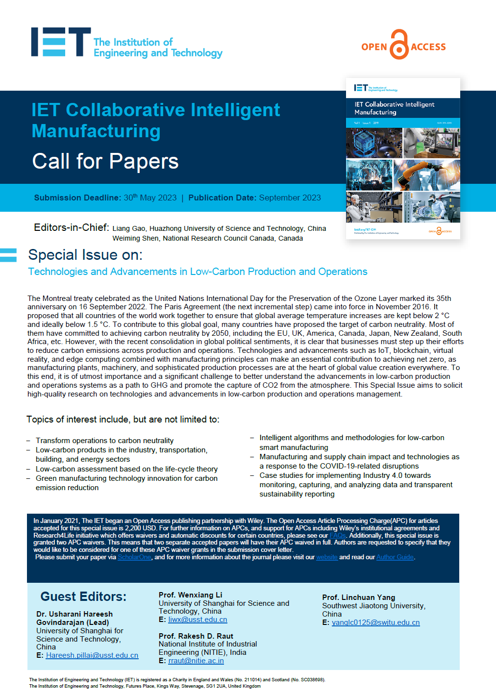 In recent decades, climate change has attracted widespread attention around the world as the world warms. With the advancement and development of science and technology, applying cutting-edge technologies such as the Internet of Things, blockchain, virtual reality, and edge computing to the process of production, manufacturing, and operation can make an important contribution to achieving the goal of carbon neutrality. To better understand the technical progress of low-carbon production, operation, and management, Two young professors Dr. Usharani Hareesh Govindarajan, and Professor Li Wenxiang from the Business School have successfully collaborated with Professor Rakesh D. Raut of the National Industrial Engineering Research Institute of India and Professor Yang Linchuan of Southwest Jiaotong University to set up a special issue Institution of Engineering and Technology (IET) to mobilize high-quality research in low-carbon management.