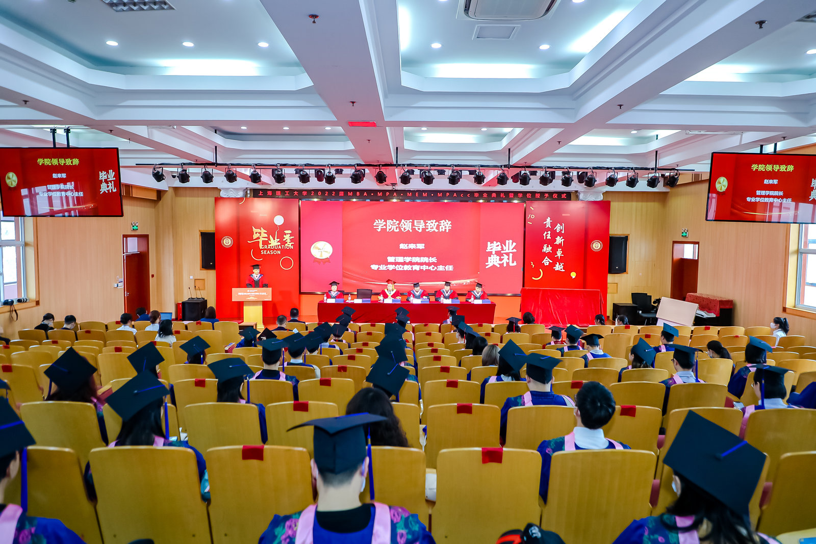 Liu Ping, vice president of USST;Cui Minguo, vice dean of graduate school, Zhao Laijun, Dean of BS-USST and Director of the Professional Degree Education Center, Ma Jingbo, Secretary of the Party Committee of BS-USST, Ren Weibing, General Manager of Shanghai Makalu International Trade Co., Ltd. and alumnus of MBA 2005, Zhang Yongqing, Vice Dean and Deputy Director of the Professional Degree Education Center, Zhang Zheng, Vice Dean and Director of MBA Program, He Jianjia, Vice Dean, Pu Yingying, Deputy Secretary of the Party Committee, Che Liping, Director of MPA Program, Ye Chunming, Director of MEM Program, Yu Qianlong, Deputy Director of MPAcc Program, Meng Chenli, Director of General Office of Professional Degree Education Center, as well as representatives of professional degree instructors, lecturers and students attended the ceremony. The commence ceremony was hosted by Zhang Yongqing, Deputy Director of the Professional Degree Education Center.