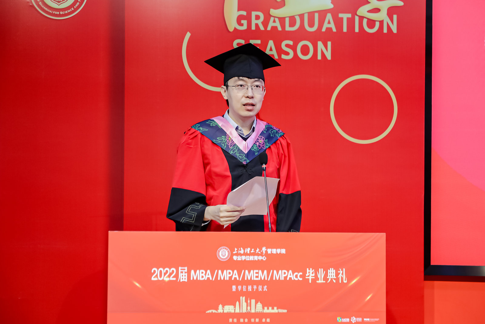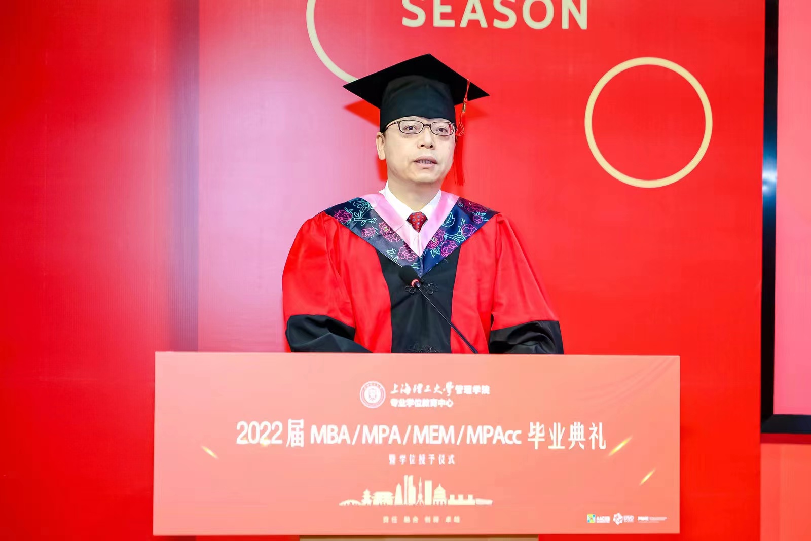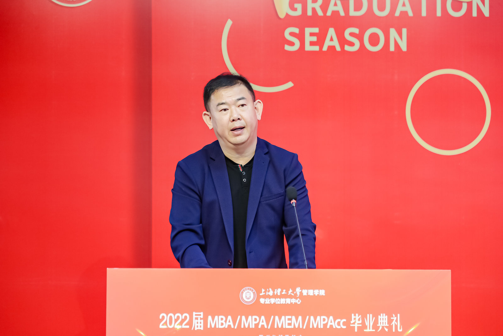 Liu Ping, on behalf of the university, expressed his heartiest congratulations to all the graduates for their success in pursuing the degree. He expressed his highest respect to the teachers and staff of the university who are engaged in professional degree education. He reviewed the history of business education of USST over the past 100 years, and the history of cooperation with MIT Sloan Business School in the reform and opening, and the history of the school's first development of senior management personnel training education in China. Liu Ping said that the university has always persisted in the basic task of establishing moral education and carried forward the tradition of relying on industry and combining industry, academia and research, focusing on cultivating project-oriented, innovative and international high-quality talents.In the field of postgraduate education, the university focuses on interdisciplinary, innovative, and industry-oriented, and has cultivated several talents with industry background and professional management knowledge in business administration, public administration, engineering management, and accounting for the society, with remarkable achievements. Finally, he hoped that students can hold on to their posts, remember the mission, take the responsibility, keep the spirit ofUSST, and keep moving forward! Live a wonderful life when you are young!