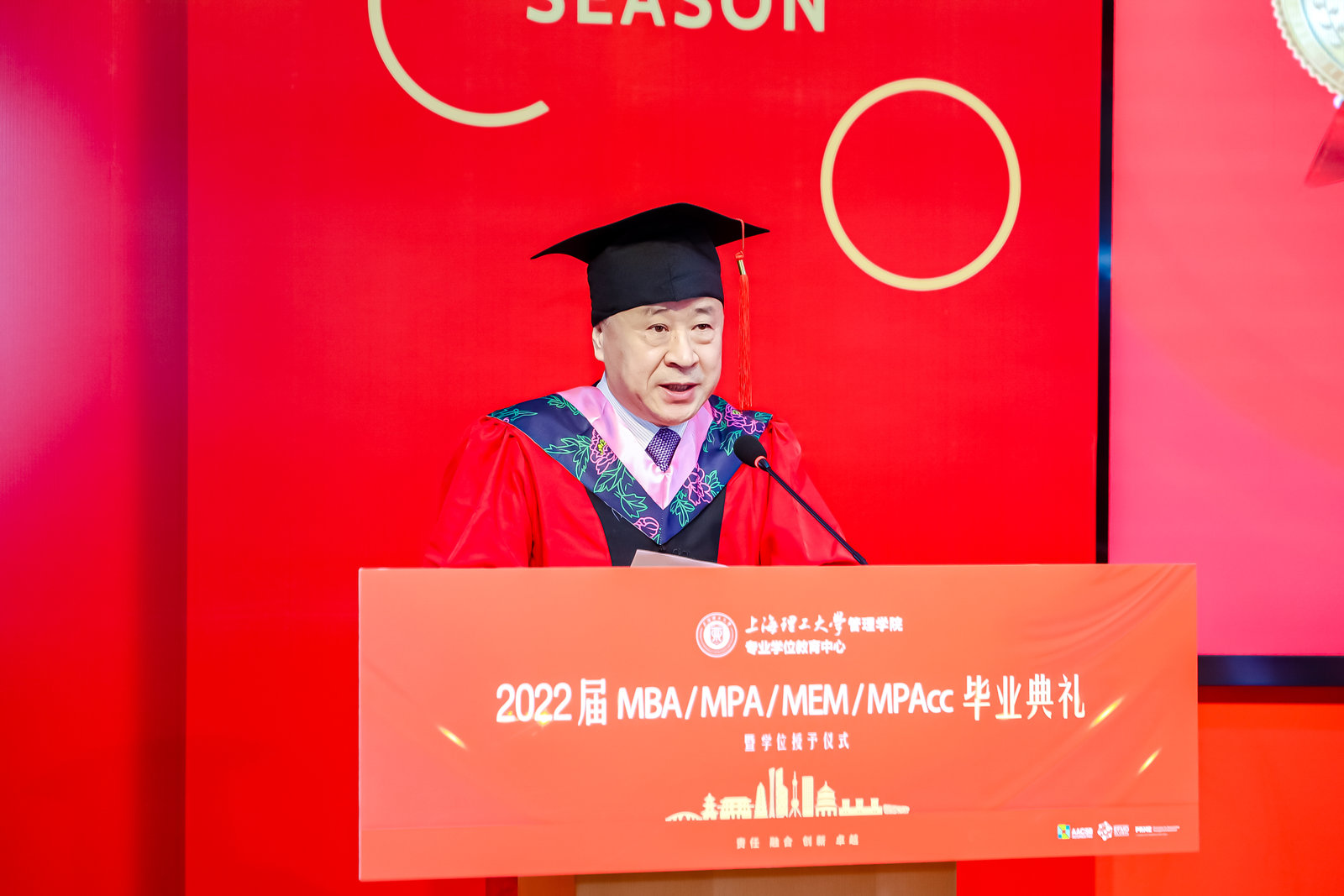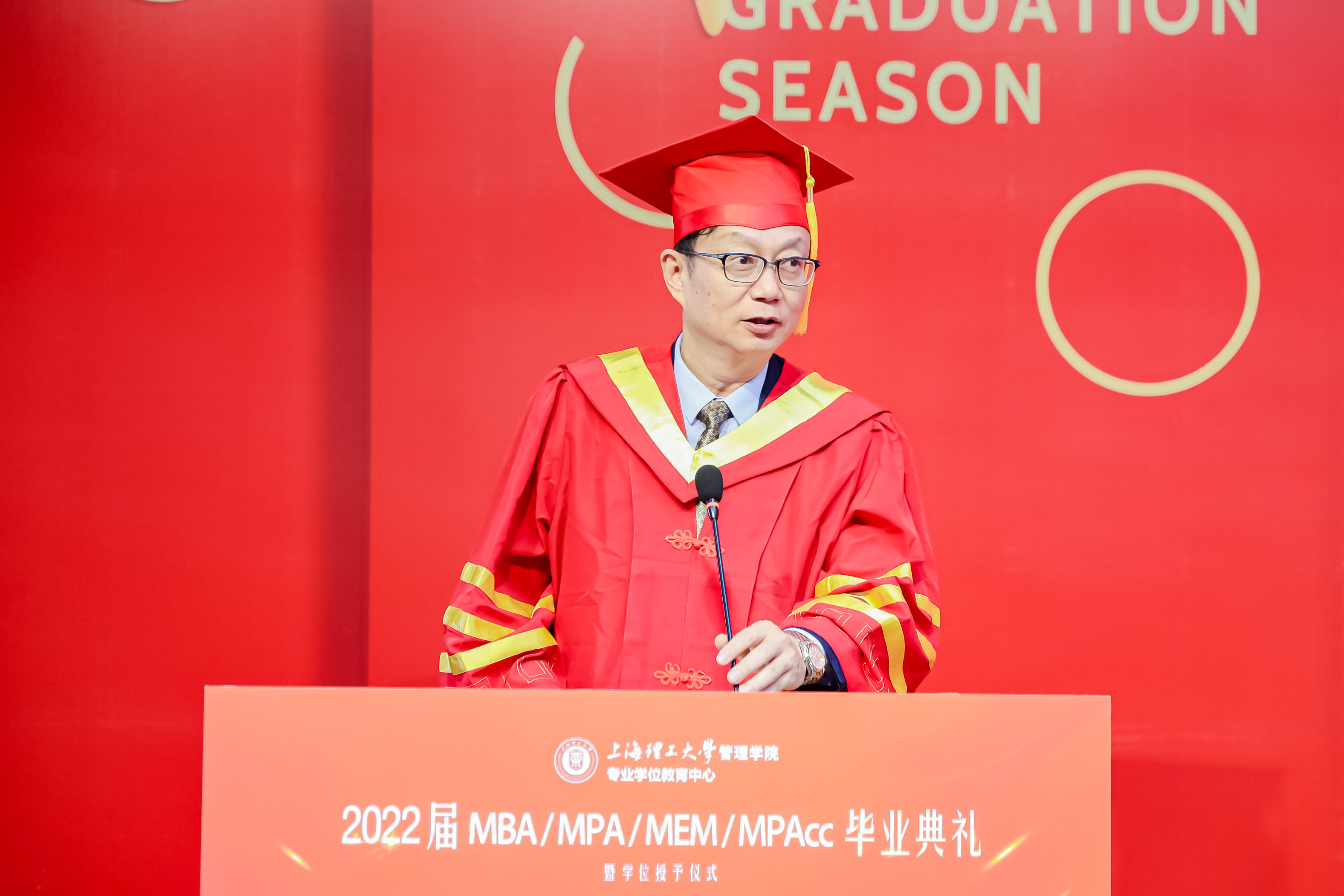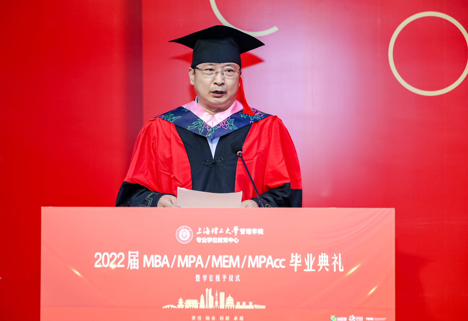 Liu Ping, on behalf of the university, expressed his heartiest congratulations to all the graduates for their success in pursuing the degree. He expressed his highest respect to the teachers and staff of the university who are engaged in professional degree education. He reviewed the history of business education of USST over the past 100 years, and the history of cooperation with MIT Sloan Business School in the reform and opening, and the history of the school's first development of senior management personnel training education in China. Liu Ping said that the university has always persisted in the basic task of establishing moral education and carried forward the tradition of relying on industry and combining industry, academia and research, focusing on cultivating project-oriented, innovative and international high-quality talents.In the field of postgraduate education, the university focuses on interdisciplinary, innovative, and industry-oriented, and has cultivated several talents with industry background and professional management knowledge in business administration, public administration, engineering management, and accounting for the society, with remarkable achievements. Finally, he hoped that students can hold on to their posts, remember the mission, take the responsibility, keep the spirit ofUSST, and keep moving forward! Live a wonderful life when you are young!