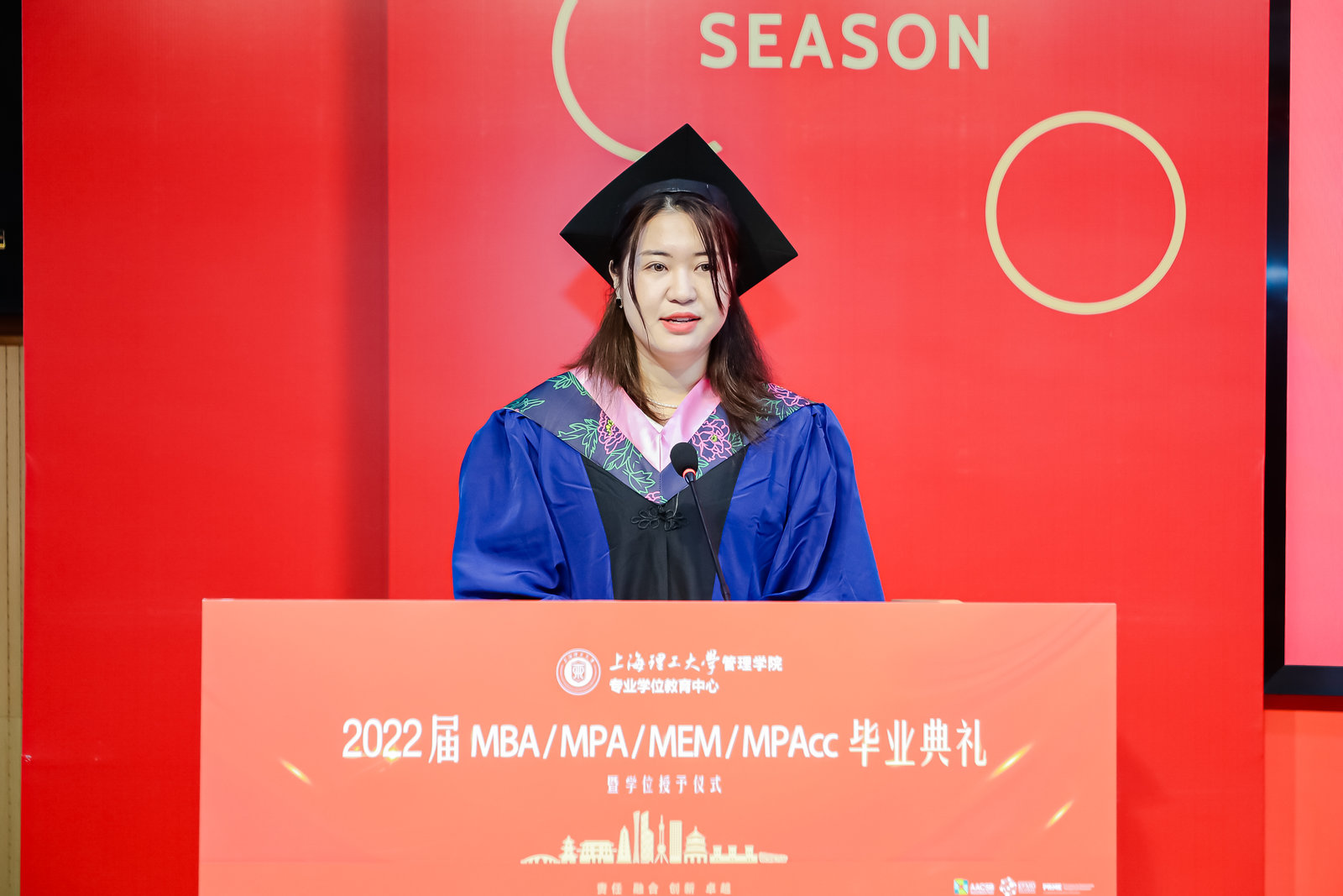 Wang Jie, a graduate of MPAcc 2022, represented the class to comment. On behalf of all the graduates of 2022 MBA, MPA, MEM and MPAcc, she expressed her gratitude to the alma mater, teachers, family and friends! Wang Jie recalled her two-year endeavor in the Business Schooland said honestly that it is not easy for a part-time postgraduate to take time jour of their busy work and life to read books, write thesis and prepare for exams. It is difficult but rewarding journey. The school offered a variety of courses, so that students can gain knowledge. She wished BS-USST a bright and prosperous future!