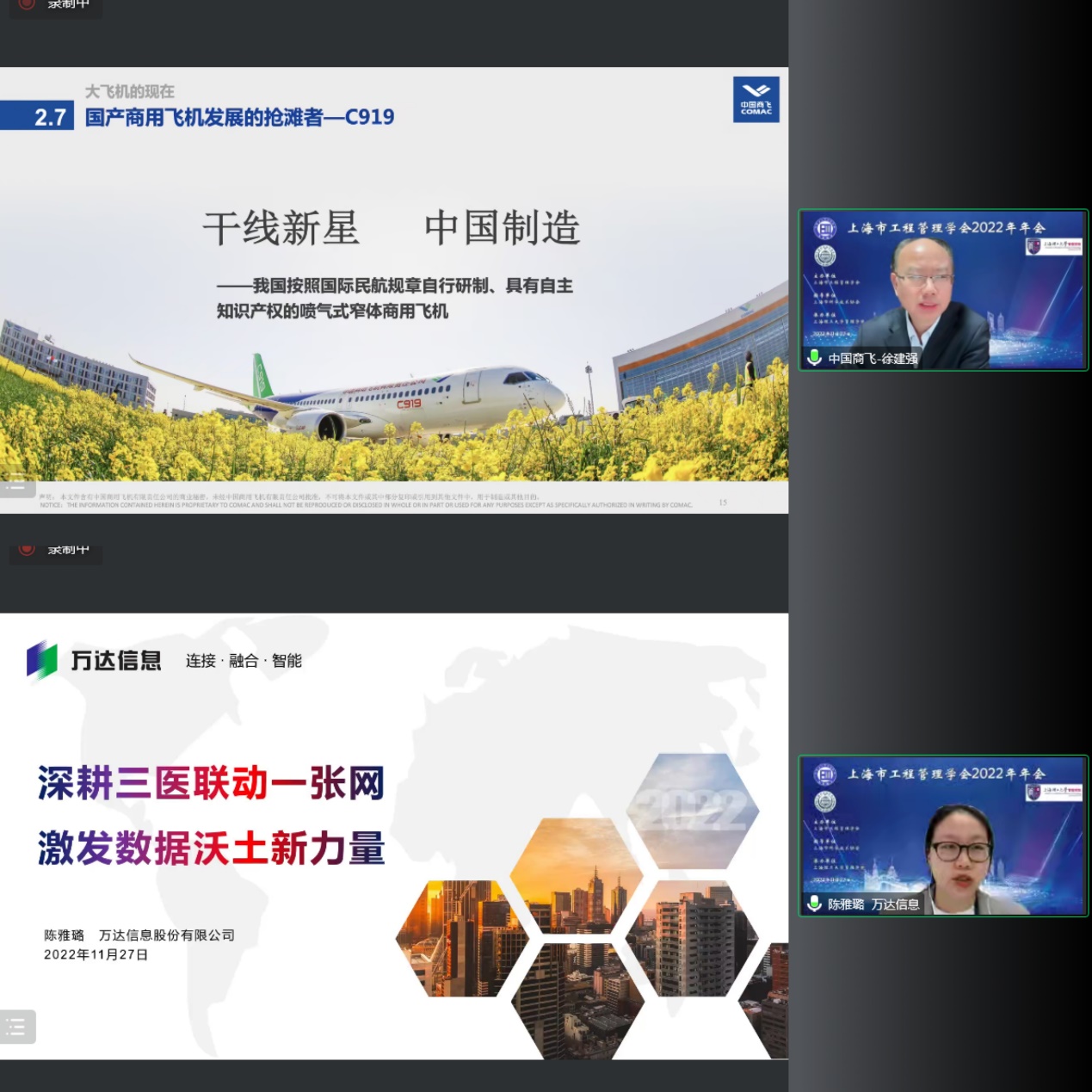 Prof. Jiang Zuhua (Shanghai Jiaotong University), Vice President of Shanghai Engineering Management Society, and Prof. Wang Tao (Shanghai Tongji Hospital), Director of the Special Committee on Health Engineering Management, presided over the conference together. Professor Xu Jianqiang, Director of Quality and Airworthiness Department of Commercial Aircraft Corporation of China, Ltd. (COMAC), gave a presentation on System Engineering and Civil Aircraft Development. He introduced the system engineering management practice of large aircraft around the requirements and technology, and comprehensively analyzed the requirements of large aircraft configuration control. Chen Yalu, Strategic Consulting Director of Strategic Planning Department of Wanda Information Co., Ltd. gave a presentation on “Deeply cultivating three medical networks and stimulating new power of data fertile ground”, introducing the construction and development prospect of data-driven medical network ecosystem by taking the first Yangtze River Delta intelligent Internet hospital and Hainan three medical networks project as examples. These two reports were closely related to the application of system engineering and digital technology in engineering management, and the participants responded enthusiastically.