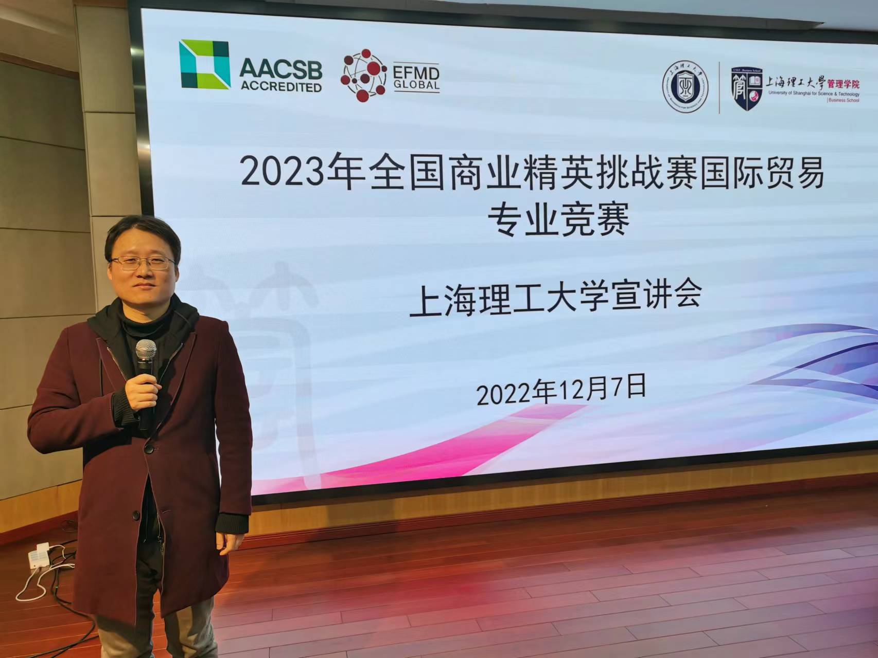 On December 7, the 2023 National Business Elite Challenge International Trade Competition promotional meeting was held in the fourth-floor lecture hall of the Business School of University of Shanghai for Science and Technology. Teacher He Wen, Secretary of the Party Branch of the Department, Teacher Tang Qiao, the main person in charge of the International Trade Competition, Teacher. Yang Le, the team of tutors, and more than 50 students attended the promotional meeting. The meeting was hosted by Zuo Jiachen, the head of International Trade Competition club.