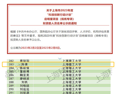 The Rising-Star Program of “Shanghai 2023 Science and Technology Innovation Action Plan (Yangfan Special Project) is a kind of Shanghai excellent science and technology innovation talent cultivation plan set up by the Shanghai Municipal Science and Technology Commission to further implement the innovation-driven development strategy, speed up the construction of a science and technology innovation center with global influence, strengthen the construction of Shanghai's science and technology talent team, and cultivate excellent young science and technology talents. It aims to select and cultivate a group of outstanding young science and technology personnel, and to encourage them to carry out original innovation and bold exploration and grow into the backbone of Shanghai's scientific and technological innovation as soon as possible.