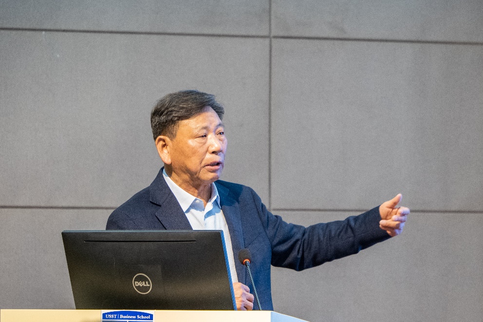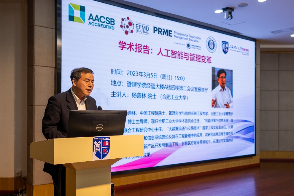 On the afternoon of March 5th, Academician Yang Shanlin was invited to our university to deliver a lecture entitled Artificial Intelligence and Management Reform for teachers and students. Sheng Chun, Deputy Secretary of the University Party Committee and Vice President, Zhao Laijun, Dean of the Business School, Ma Jingbo, Secretary of the School Party Committee, and Pu Yingying, Deputy Secretary of the School Party Committee, attended the seminar. More than 100 teachers and students from the university participated in the seminar. The seminar was chaired by Sheng Chun.
