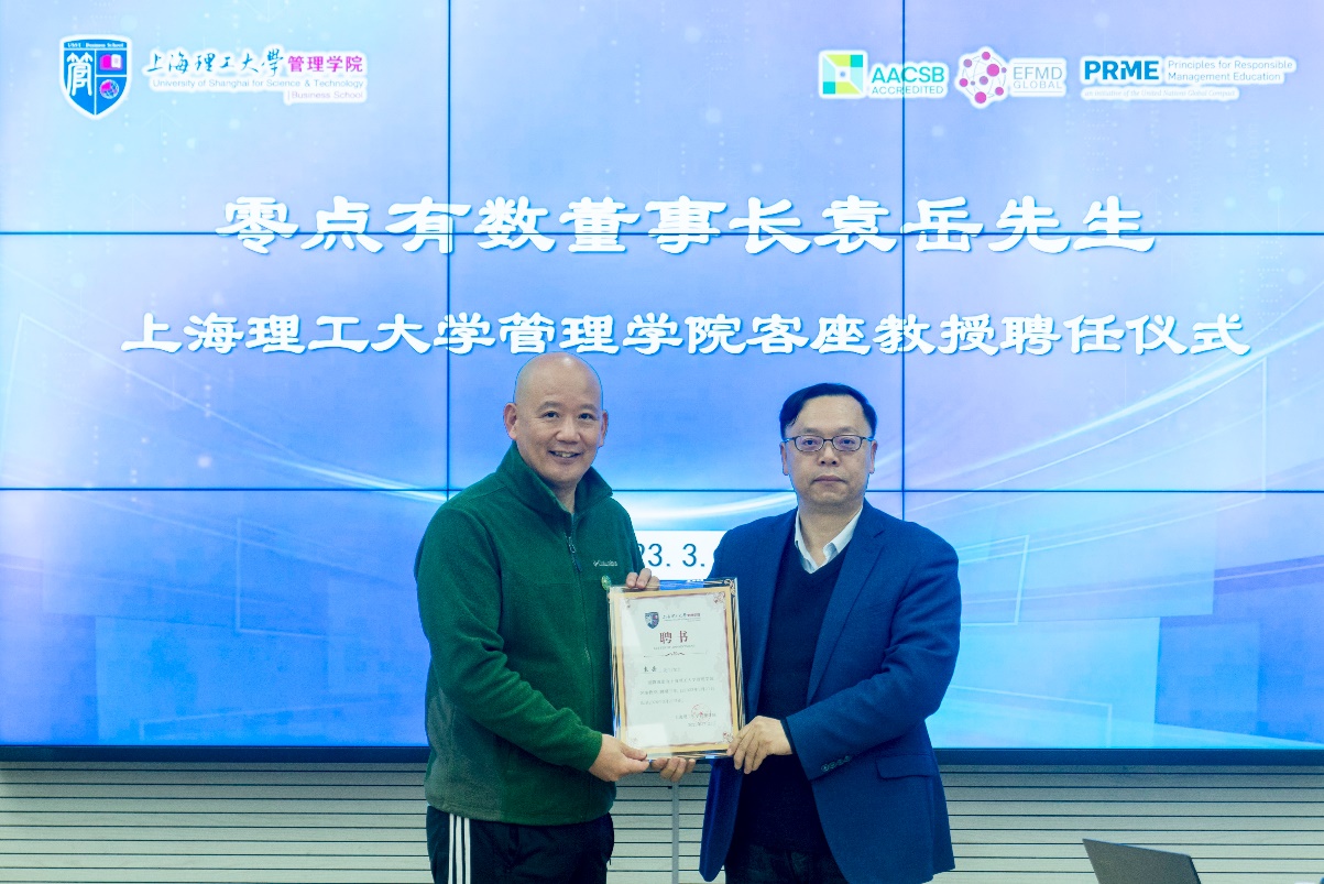 At the appointment ceremony, Dean Zhao Laijun delivered a welcoming speech and presented the guest professor certificate to Mr. Yuan Yue. Attendees included alumni from the Business School of University of Shanghai for Science and Technology and founder and CEO of Ruiwen, Qiu Yumei, the school's Party Secretary Ma Jingbo, members of the school's Party and government leadership team, and relevant personnel from the Professional Degree Education Center. The ceremony was chaired by Vice Dean Zhang Zheng.