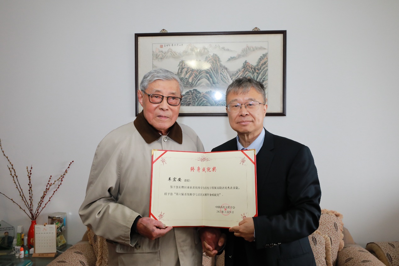 On November 26, 2022, the Chinese Society of Systems Engineering presented the 6th Lifetime Achievement Award for Systems Science and Systems Engineering in Dalian. Professor Che Hong'an from Shanghai University of Technology and Professor Wang Hao from the University of National Defense Technology were both awarded the award. Due to the conditions at the time, Professor Che Hong'an was unable to personally go to the scene to receive the award. Yang Xiaoguang, Chairman of the China Society of Systems Engineering, visited Professor Che Hong'an's home in Shanghai this time to personally award the award to Professor Che, and had a long academic exchange with him. Finally, he sent his wishes for health to Professor Che.