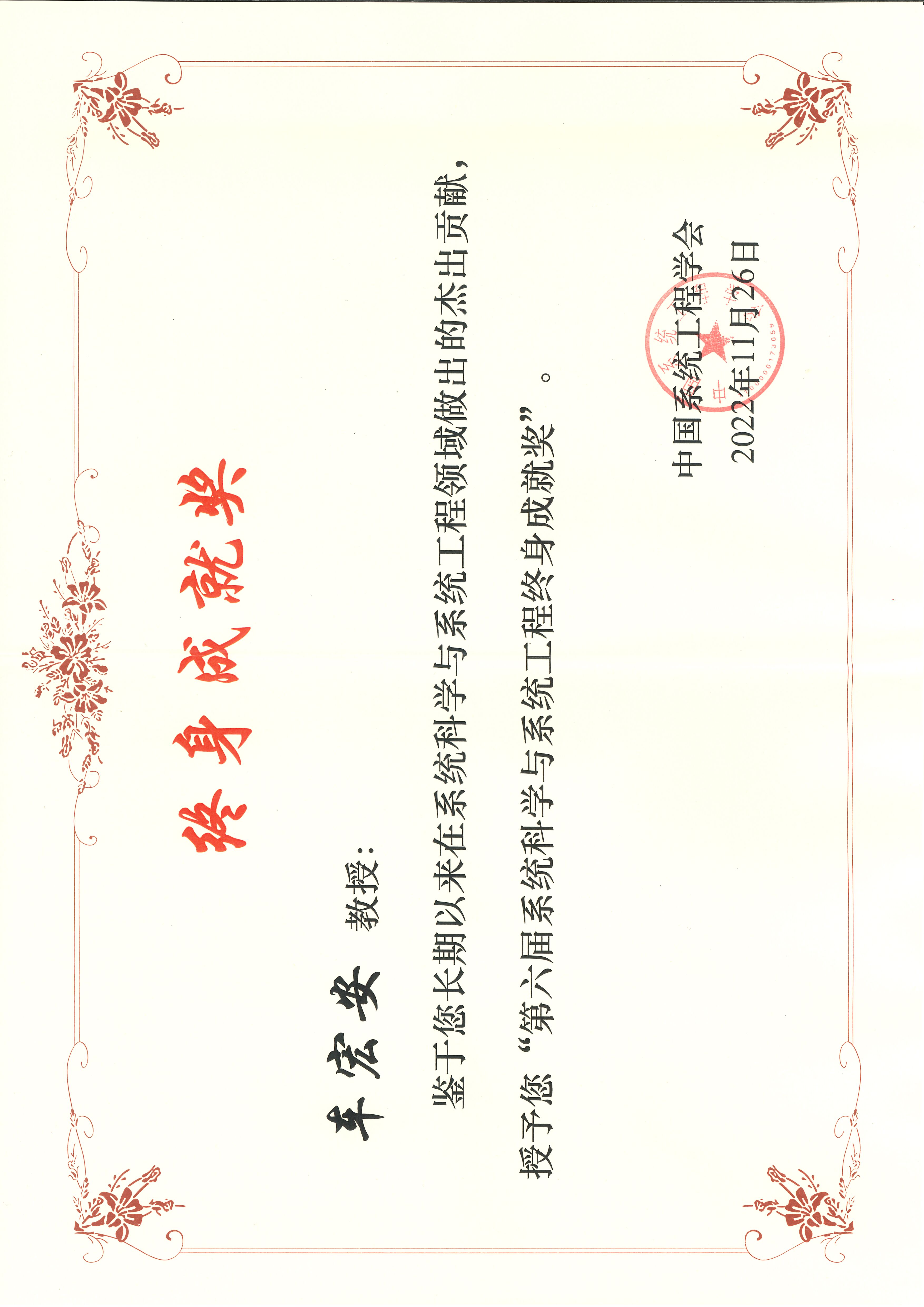 The Lifetime Achievement Award established by the Chinese Society of Systems Engineering is the highest award of the System Science and System Engineering Science and Technology Award. The System Science and System Engineering Science and Technology Award aims to recognize individuals who have made innovative theoretical achievements in the field of systems science and system engineering or have made significant social or economic benefits in the field of systems science and system engineering. Previous winners of the Lifetime Achievement Award include Academician Liu Yuanzhang, Academician Wang Yingluo, Academician Wang Zhongtuo, Researcher Yu Jingyuan, Academician Chen Hanfu, Academician Dai Ruwei, Researcher Gu Jifa, Academician Yang Shanlin, and Professor Chen Xikang.