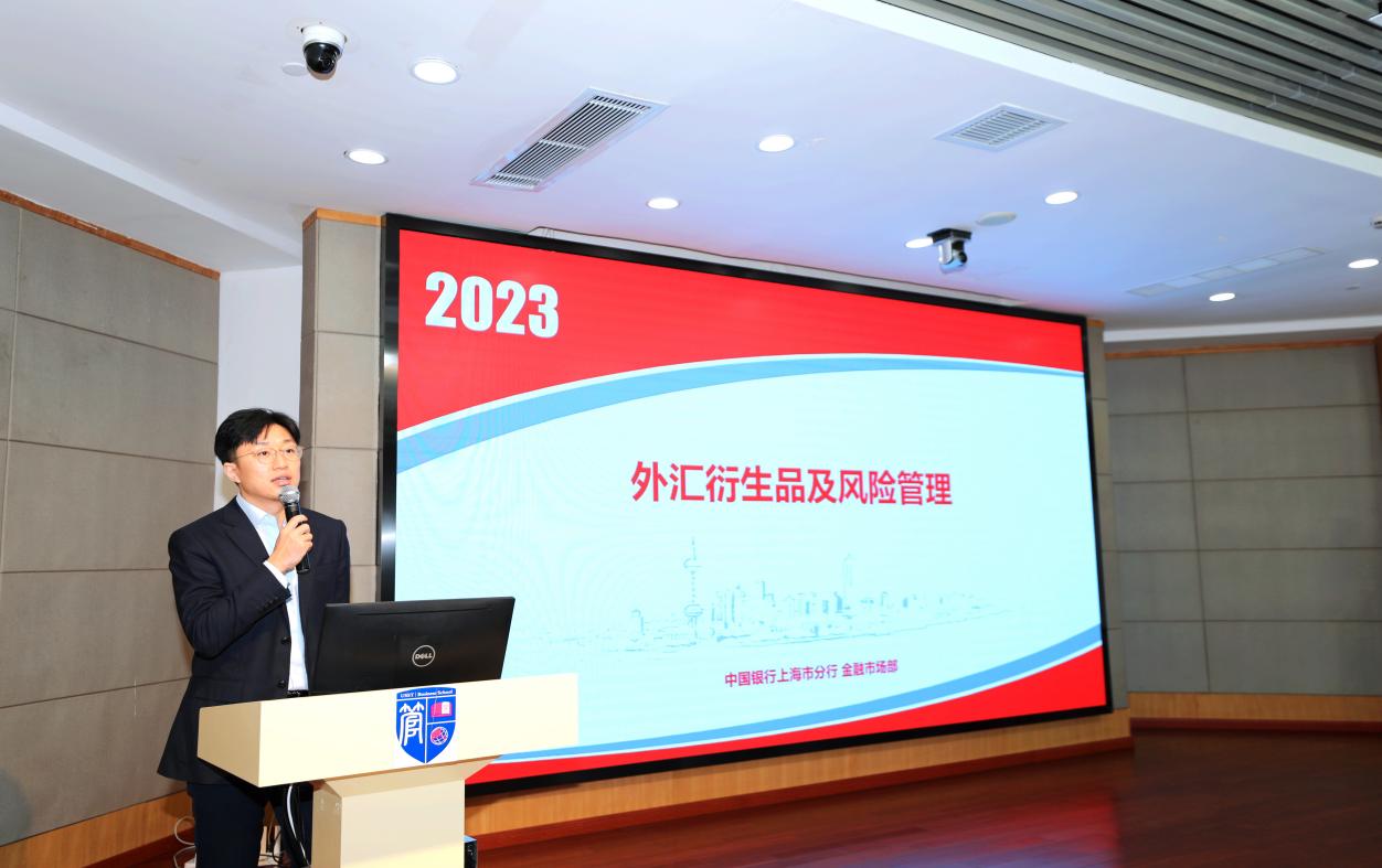 On the morning of April 12, Wu Jun, a director-level trader of the Financial Markets Department of Bank of China Shanghai Branch, taught a course on International Finance to the undergraduate students of finance in the Business School. He Zhenghua, Administrative Department of Bank of China Yangpu Branch, and Zhang Qinglong, Head of Finance Department, attended the course.